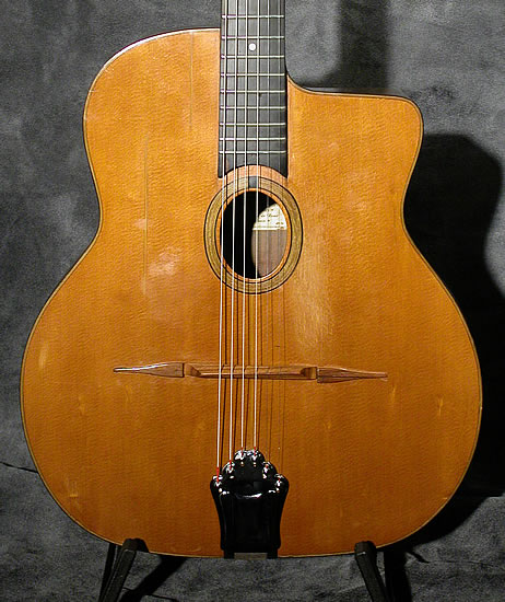 Sold by Jacques Camurat on the street of Rome. If the look of the guitar shows its age slightly, the sound is strong, typical of Favino. Large very round sound partly related to the width of the case, with the action a hair higher than that of the usual Selmer copies. A collector!
