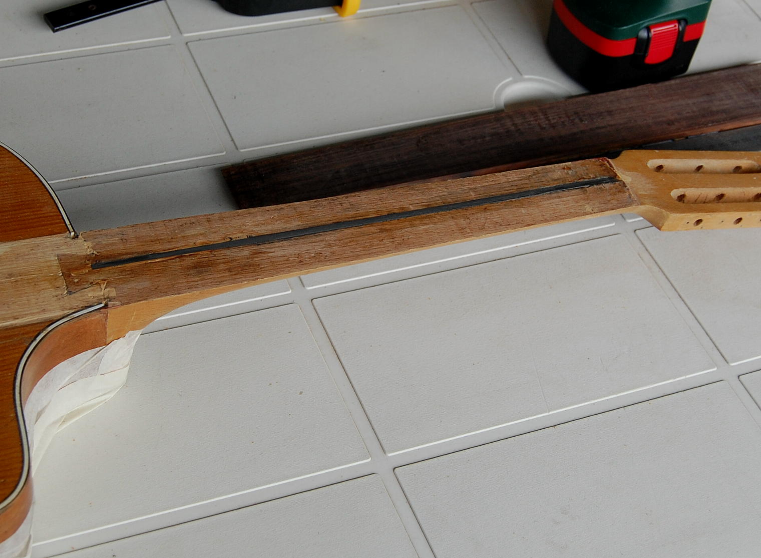 I steamed the neck butt-joint apart and straightened the bowed neck with a couple of carbon fire rods, refret is done - tricky in the soft pearwood (?) fingerboard - but I still need to level & crown. I'm trying a bolt-on conversion to correct the neck angle, final angle adjustments with strings on (then glue down the fingerboard extension).