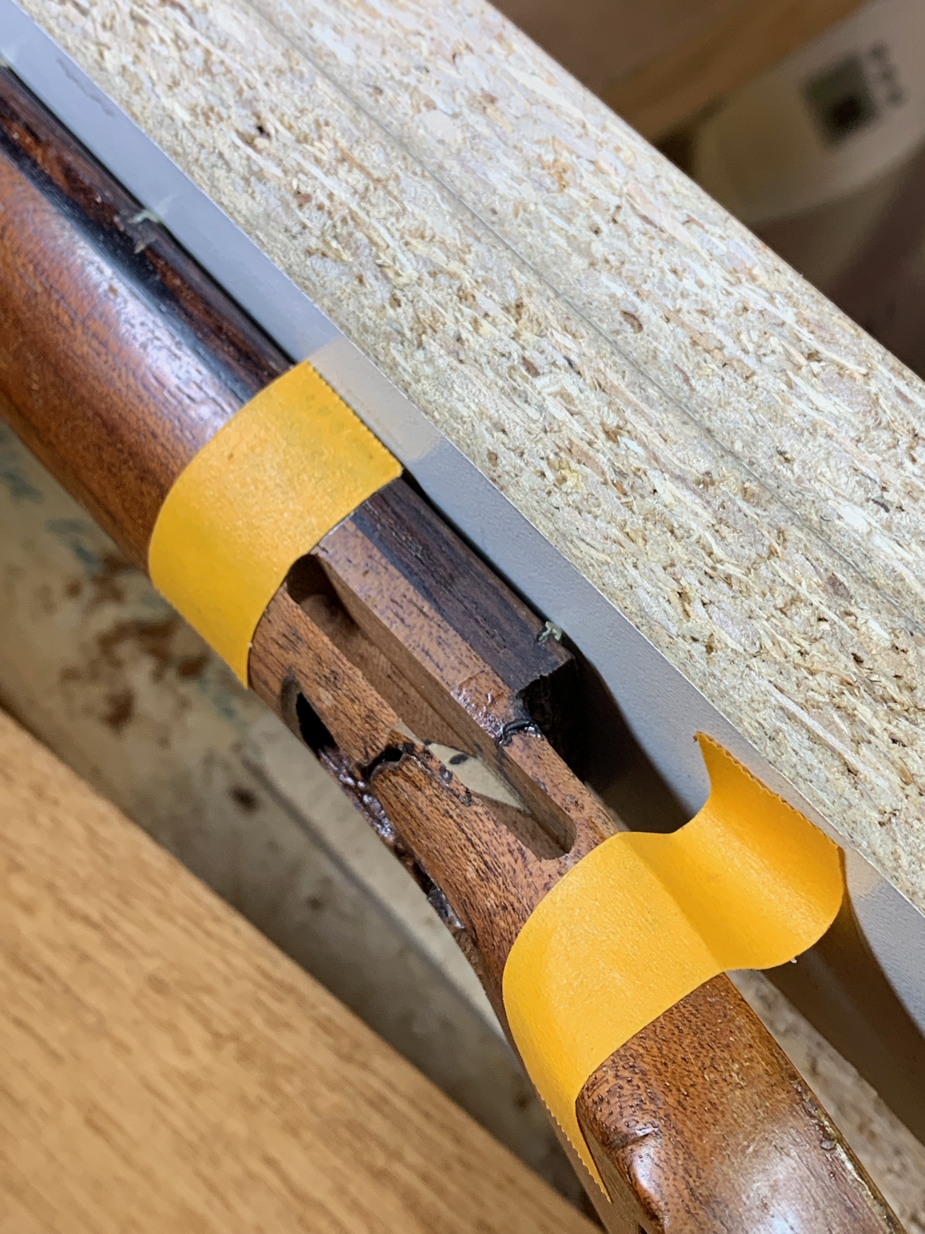 Well, the DiMauro is back from the shop - hopefully permanently. Jim first completely disassembled the mystery repair. The three short dowels were ineffective at best.
