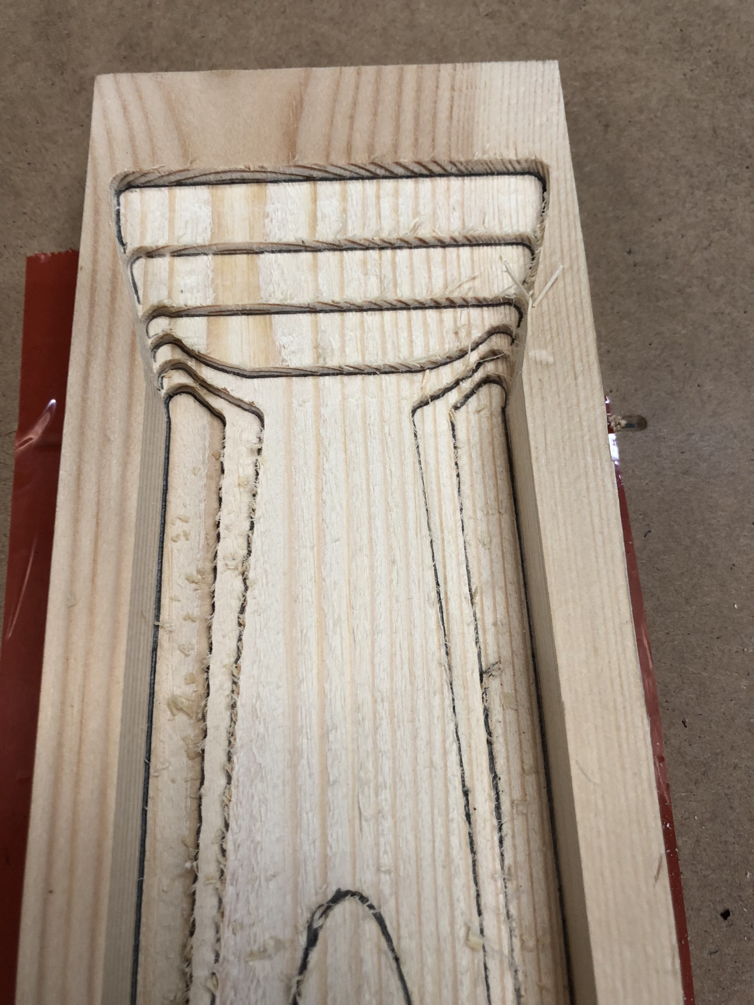Last week I bonded the three 13mm x 3mm carbon fibre reinforcements into the necks using West System epoxy. Today I machined my first 3D modelled necks and it was actually considerably more straight forward than I had anticipated. Cross sections and their paths were drawn in Adobe Illustrator and then imported into Rhino. The surfaces were then lofted and the model imported into Vectric VCarve Pro which then created a roughing path and a finish path along with a registration line and a mask cut out for the vacuum bed of the CNC router. There are a few small anomalies in the machining at the sides of the volute but nothing that can’t be fettled by hand. Overall I think it worked pretty well. I ran a test section in softwood before committing one of the ‘real’ necks.