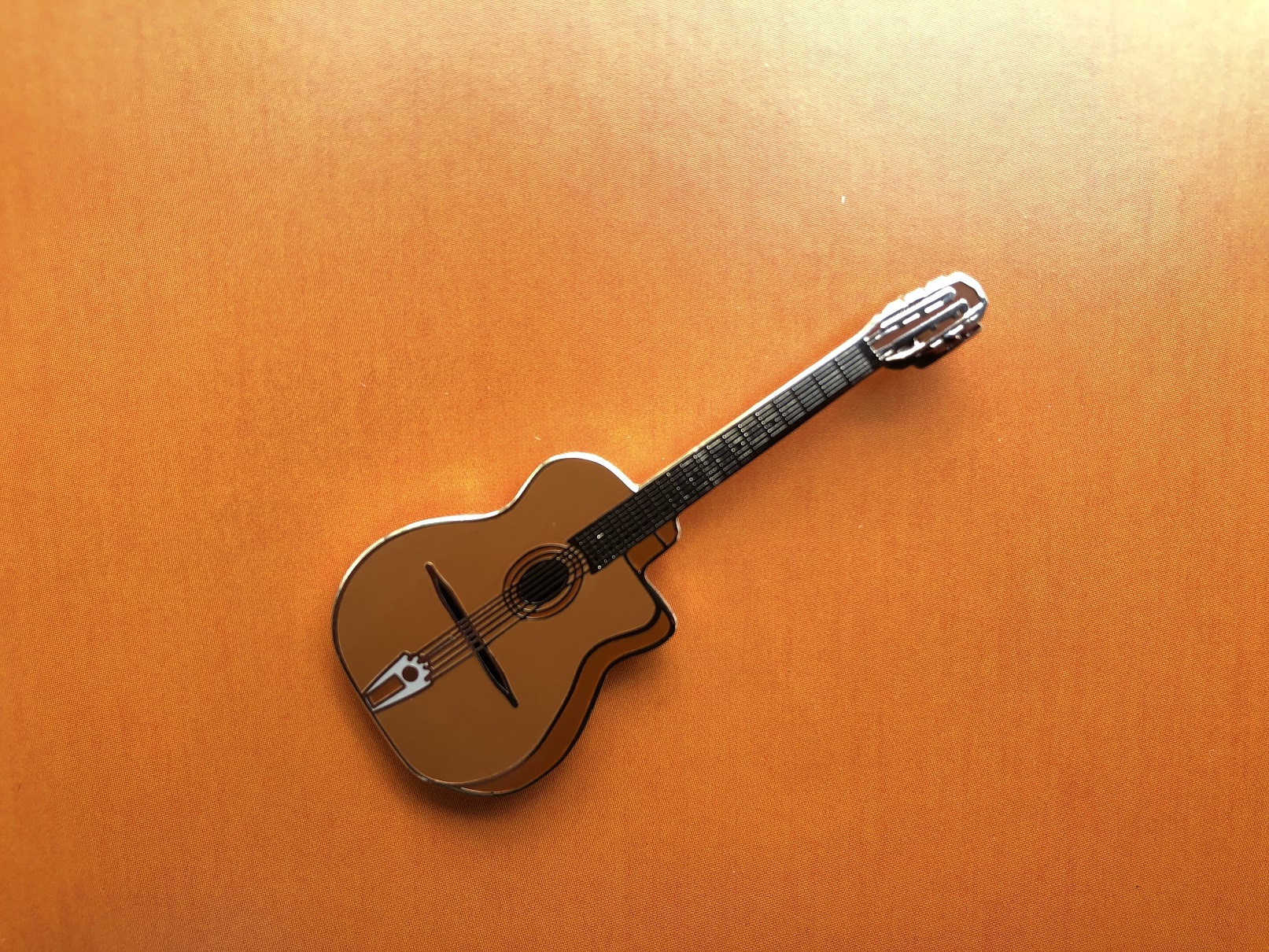 The Dutch Hot Club de France Association has produced new metal pins of the infamous Selmer guitar model. It is about 4 cm long (1,5 inch), it is made from metal with golden accents and porcelain enamel (emaille) paintwork. This beautiful ornament has a nice metal button clip at he back so you can easily wear it in your lapel buttonhole. You can put it on your hat or sweater as well. It is a classical pin to show you dig this music.