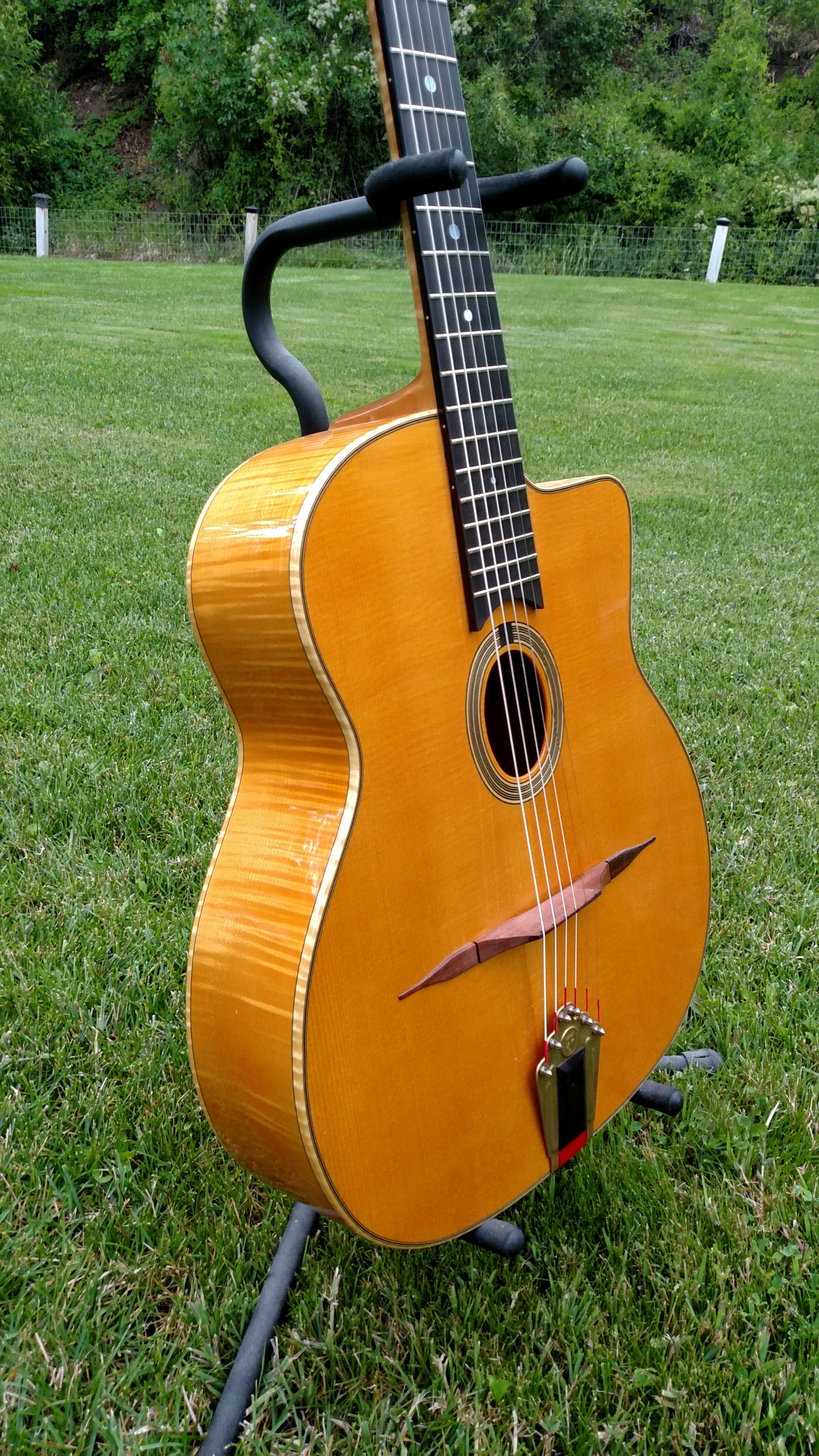 The Modèle Encore features Selmer dimensions: 670mm scale, 15 3/4" lower bout, and a 3 7/8" body depth. The top is European spruce and the back, sides, and neck are made of solid flamed maple. A bigtone pickup has been installed.