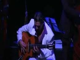 He tries the guitar in parking lot and then we see him playing it in concert.
