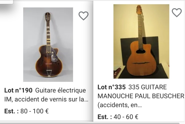 the *real* bargains are maybe amongst the www.interencheres.com auction listings: that Beuscher, Lot 335, is a re-labelled Henri Miller, I think (help me out here, Chris!), and I'll take the big re-labelled Gerome (plus one other guitar) for 100 Euros any day. Sometimes the auction house can arrange shipping to UK and USA, sometimes you've got to organise it yourself, its up to you & your French language skills to arrange ;-P