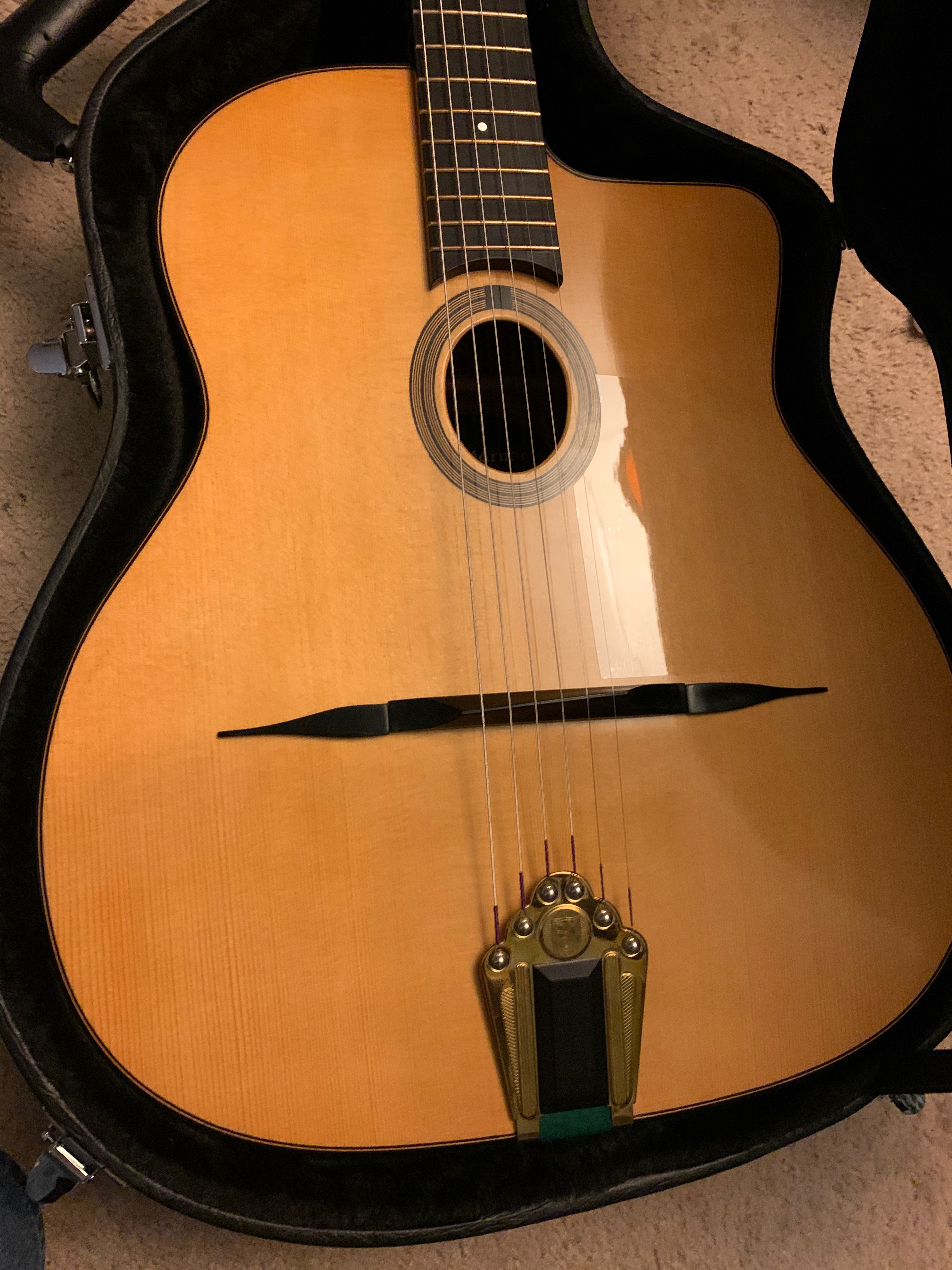 I ordered this beautiful guitar in December of 2018 and received it in February of 2019. Craig builds a beautiful guitar! I custom ordered a couple of things on the guitar including the French Polish finish and the hardware. It is in mint condition and not played more than one hour since I purchased it. I'm not playing as much Gypsy music as I thought I would, so here is your opportunity to purchase a beautiful Bumgarner Gypsy guitar at a reduced price.