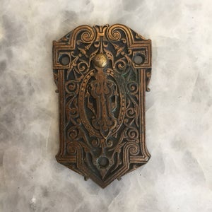The Vintage Harmony Kay Regal tailpiece I got on Ebay, and the  Cast Bronze Victorian Keyhole Escutcheon I got on Etsy.