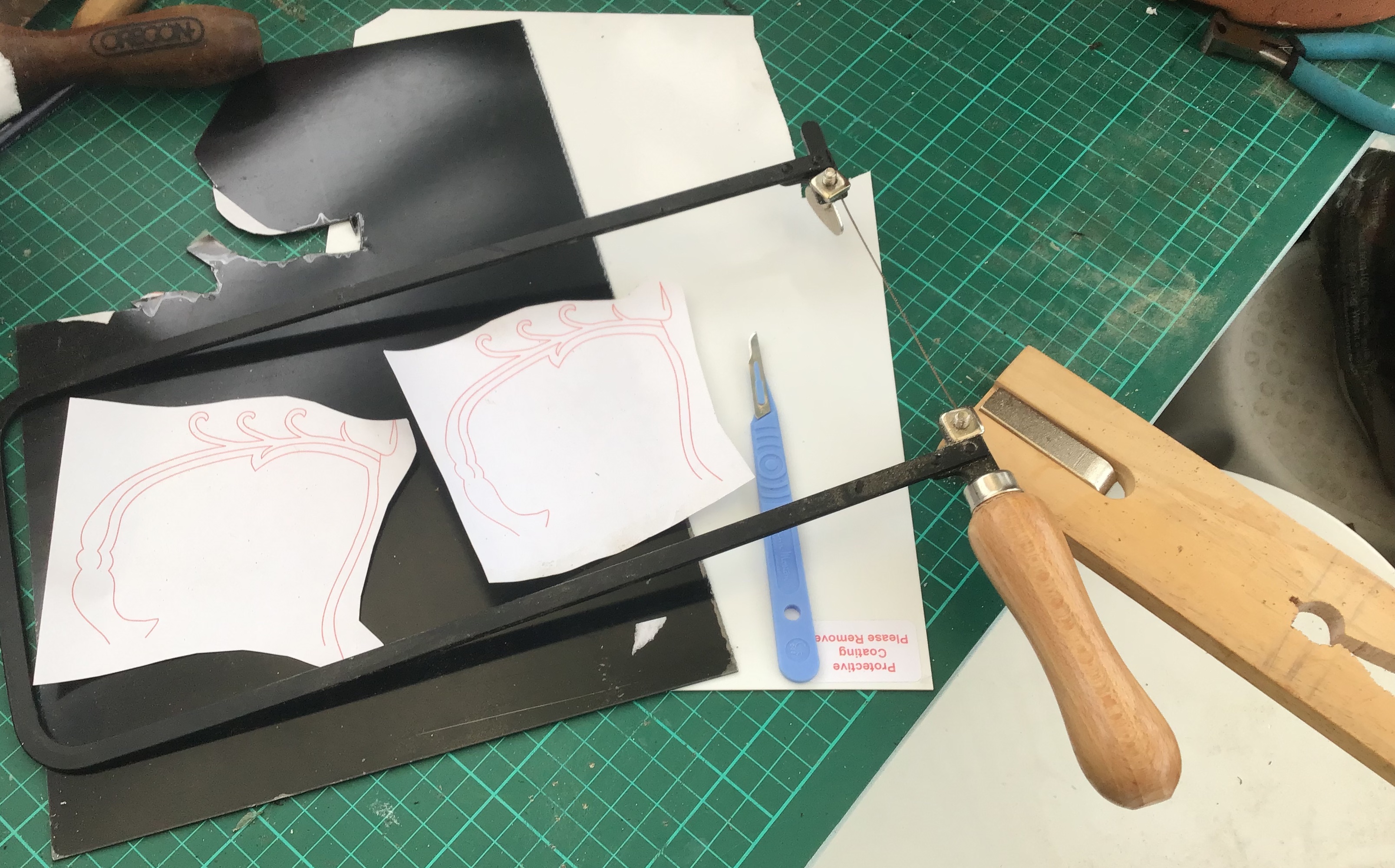 Regarding the inlay work, I've posted a few pics of the screen grabs of redesigning the inlay in the Mac on top of scanned-in paper tracings already - I printed 5 or 6 copies of the final design onto one sheet of 1-per-sheet sticky label paper. Affix to 1mm sheet plastics & cut with jeweler's saw. A sharp craft knife would do as well, to be honest. File & sand to fit.