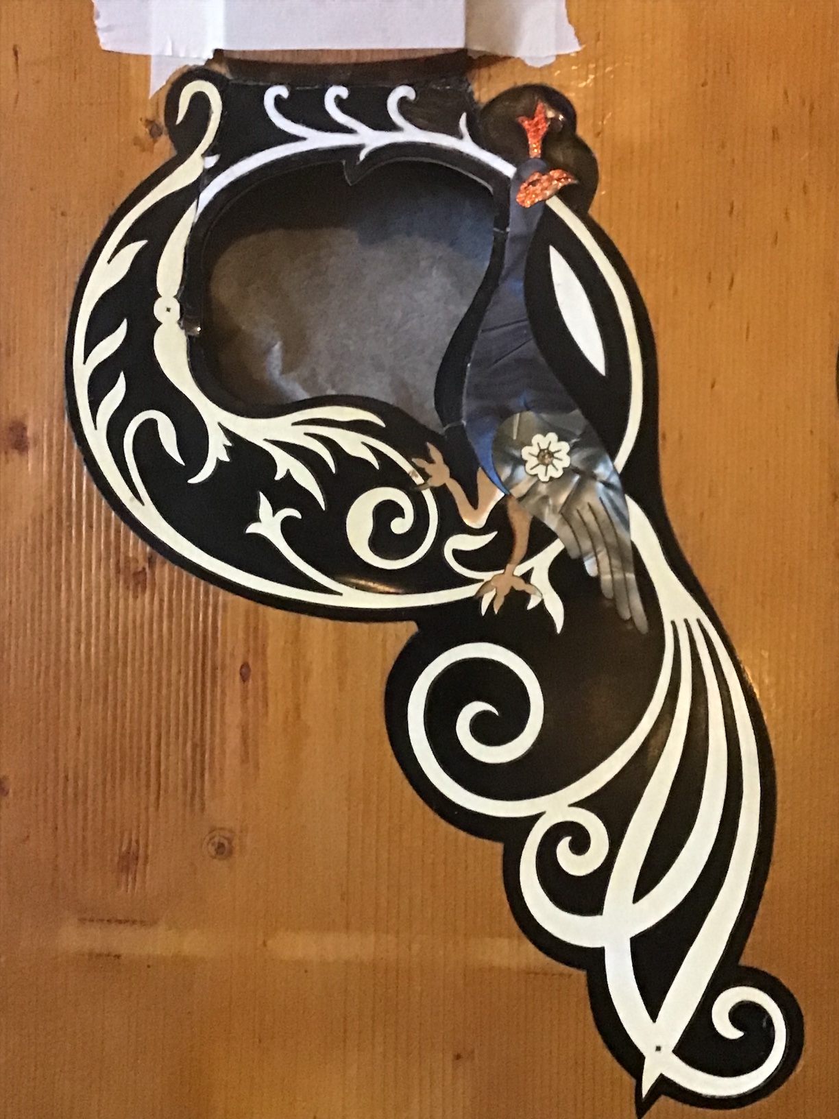 ( Some of the detail work on other inlays is done with ink or paint -here the peacock's face & crest are painted.)