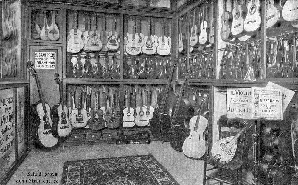 Not quite Sicily, but a great shot of part of the shop / workshop of Antonio Monzino IV & Sons, in Milan, northern Italy, from 1914- it shows the types of guitars and their decoration that were being sold - it might suggest some of these Sicilian guitars could be a little older than we think (although I agree the bar frets vs original tanged frets is a good data point). Most of the guitars seem to have fixed bridges.