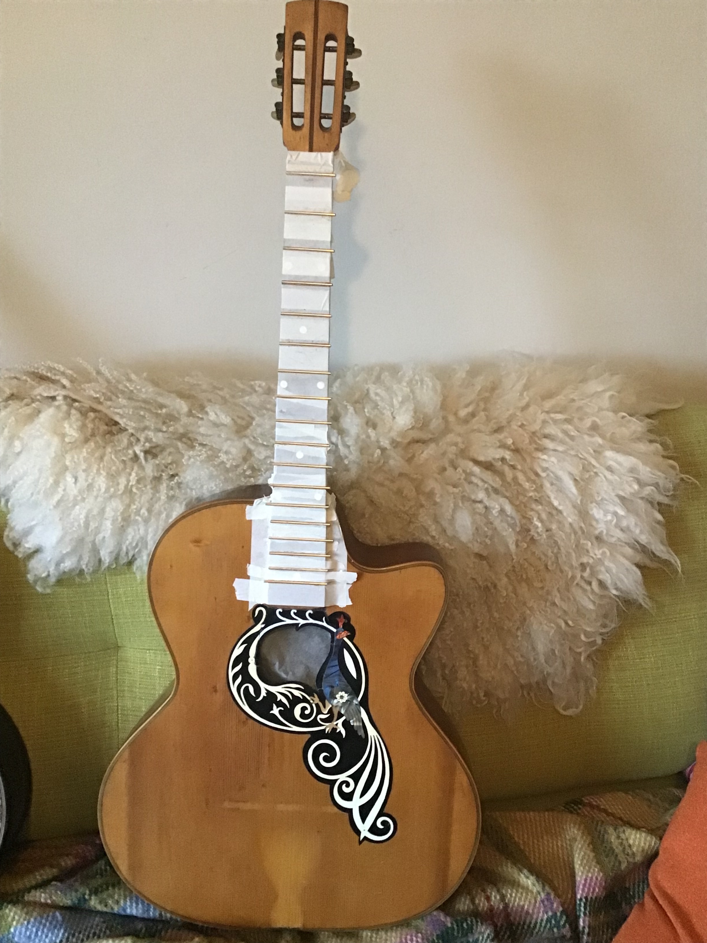 on the Antonino Napoli, the new frets are in, needing trimmed & levelled, and the repair work to the top & inlay is complete- still a few raised edges on the old inlay to reglue and one of the bird's legs to remake.. I'll use acrylic or oil paints as a caulk between the cracks and as a detail touch-up and a final polish. ( Catanian luthiers used, I think, a black volcanic ash mix as caulk.)