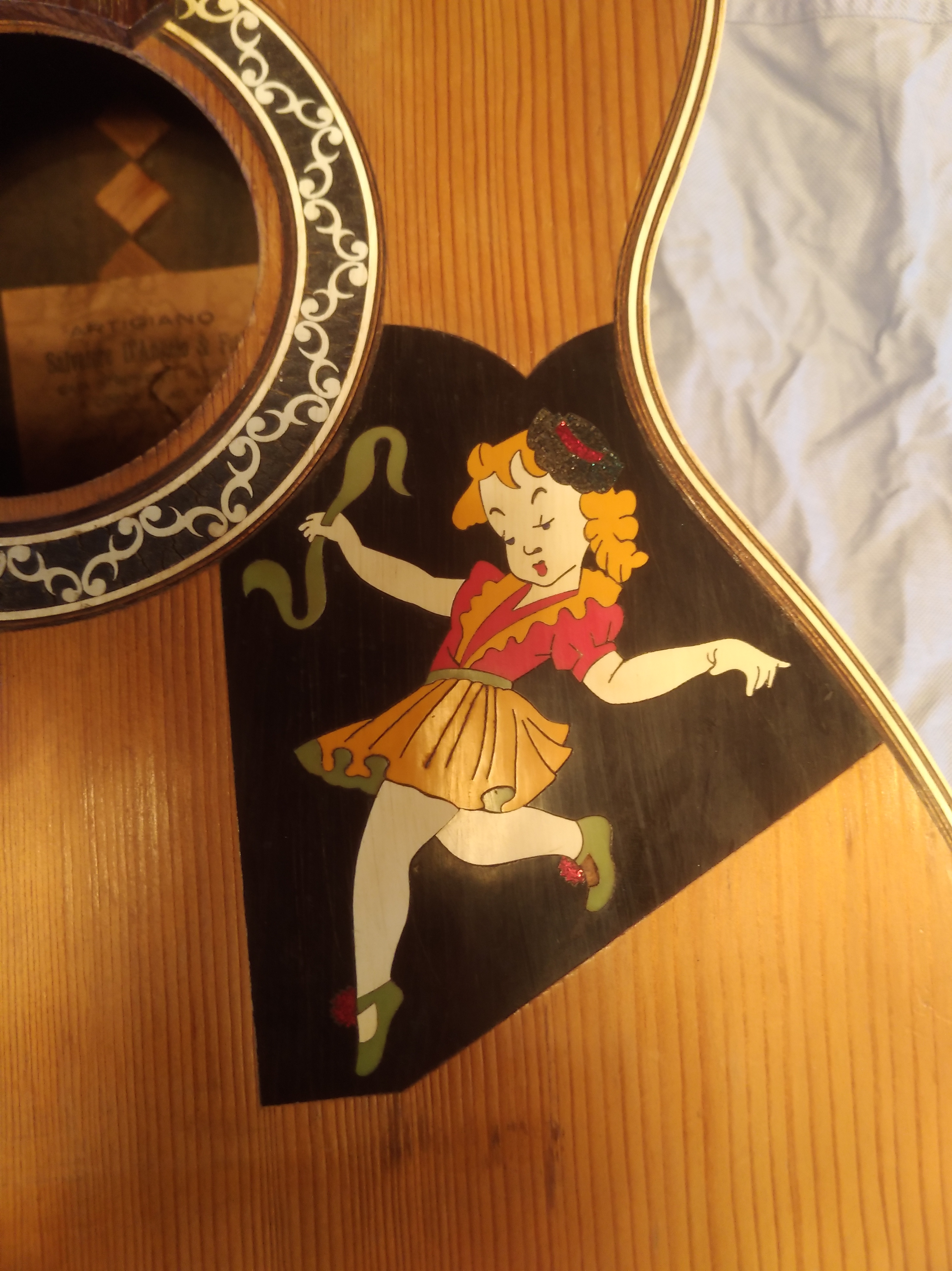 The pickguard with the dancing girl needs to be reglued on a little spot ( the front leg it's lifting a bit). I was thinking of swap the tailpice, adding this one on the Caponnetto and buying a vintage one for this one.