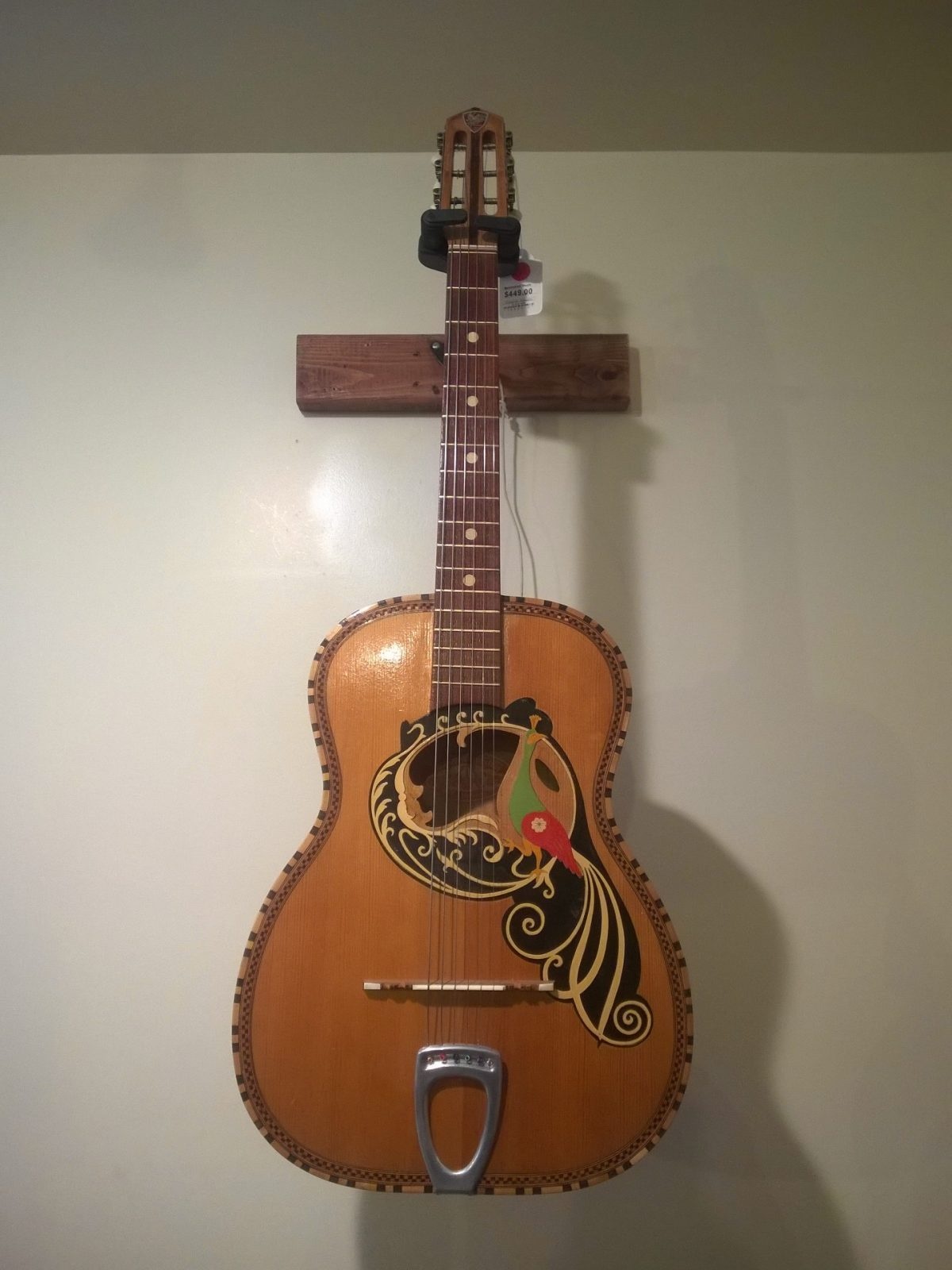 Wow!, great picture, @billyshakes - I have a picture of a very similar guitar on file somewhere, can't access it just now, though, and I can't remember who made it. The aforementioned Vincenzo Miroglio did make guitars a/ in that body-style, and b/ using that (pre-made) intaglio peacock / lyre-byrd. Here are two V Miroglios: