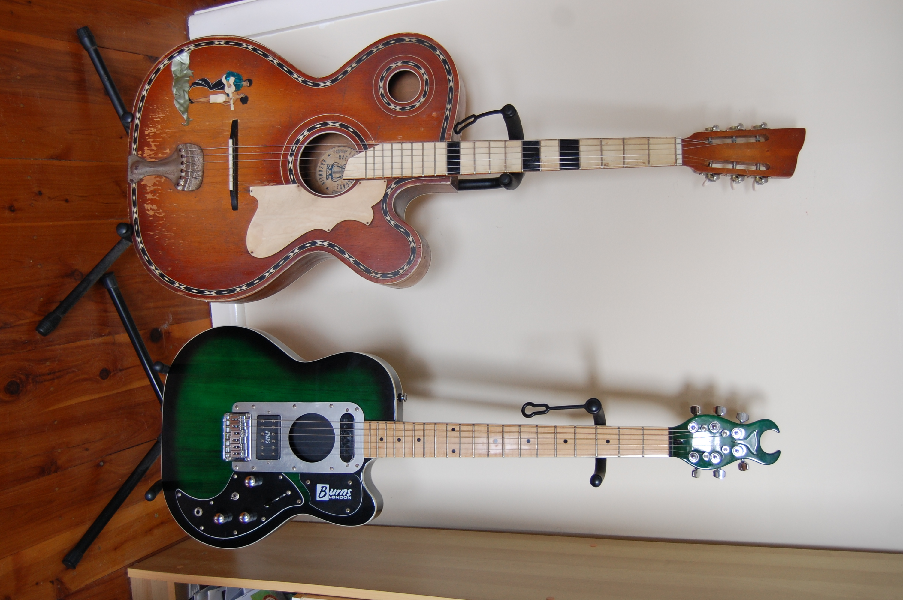 Wandering off topic a little here as this one is not Sicilian but you can blame AndyW for that. A few posts back he posted a photo of a Kremona to out-bling the Sicilians. Well, I bought one. All the way from Bulgaria to Australia it has joined my collection of weirdos. Having said that it plays and sounds just fine. The odd shape does not get in the way, the neck is a little on the thick side, a bit 'clubby' but not so much that I can't adapt. No idea what strings are on it now, but I will try some Argies some time. I don't know if the extra soundhole really makes any difference; not to the player at least although someone in front of the guitar may be able to discern some extra projection? A thought for a future experiment. The little picture on the lower bout is actually inlaid not just a transfer print. For some reason it seems to have palled up with my Burns Steer.