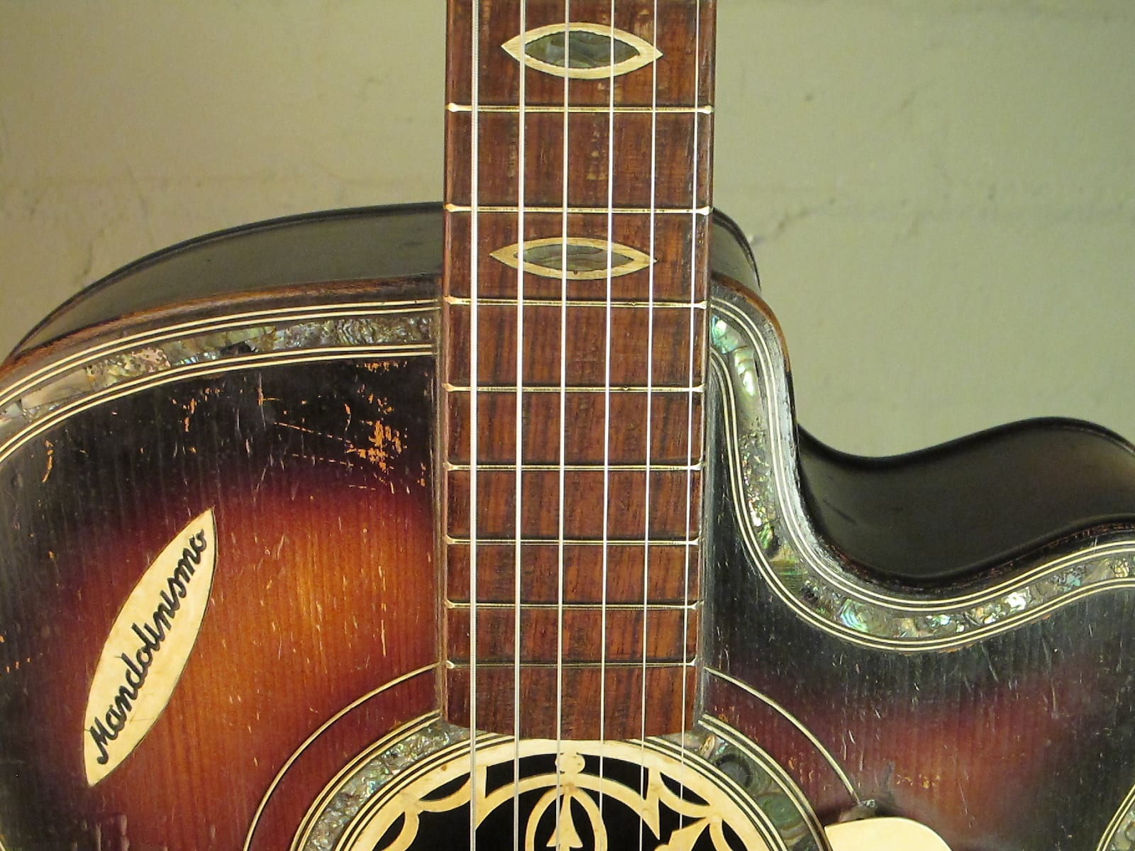 Notari imported Italian Instruments and published a fortnightly magazine for Mandolin players, "Mandolinismo", hence the inlaid importers mark]
