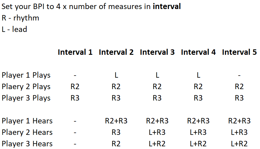 A quick diagram of how Normal NINJAM mode works, where one hears the previous interval that other players played: