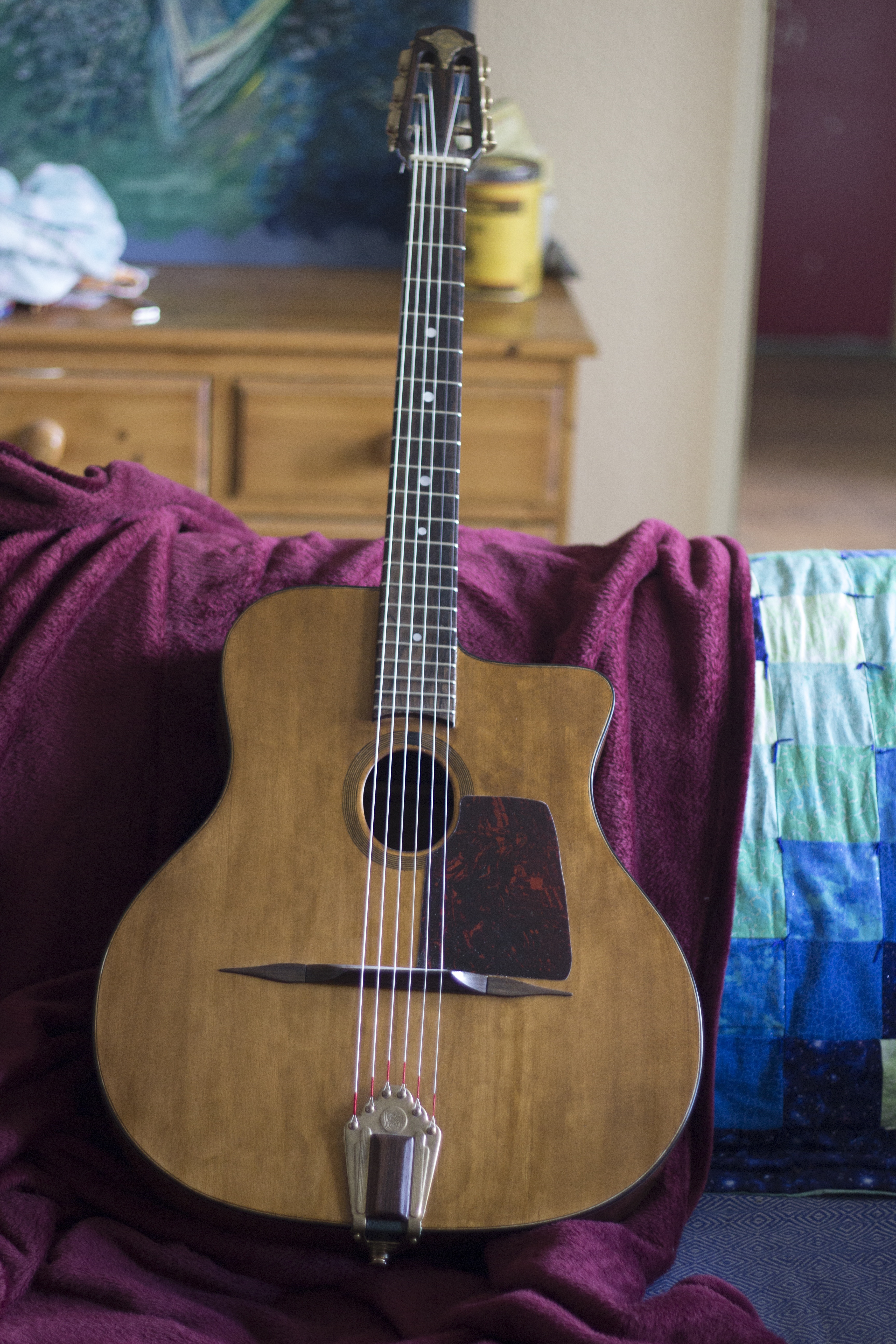 2010 Boonstra Walnut Special: Gorgeous figured Walnut back and sides, Coramandel neck, Bocote fingerboard, aged spruce top. Favino width. Full, strong, balanced tone. A Great gypsy style guitar from one of the best Luthiers in Europe.
