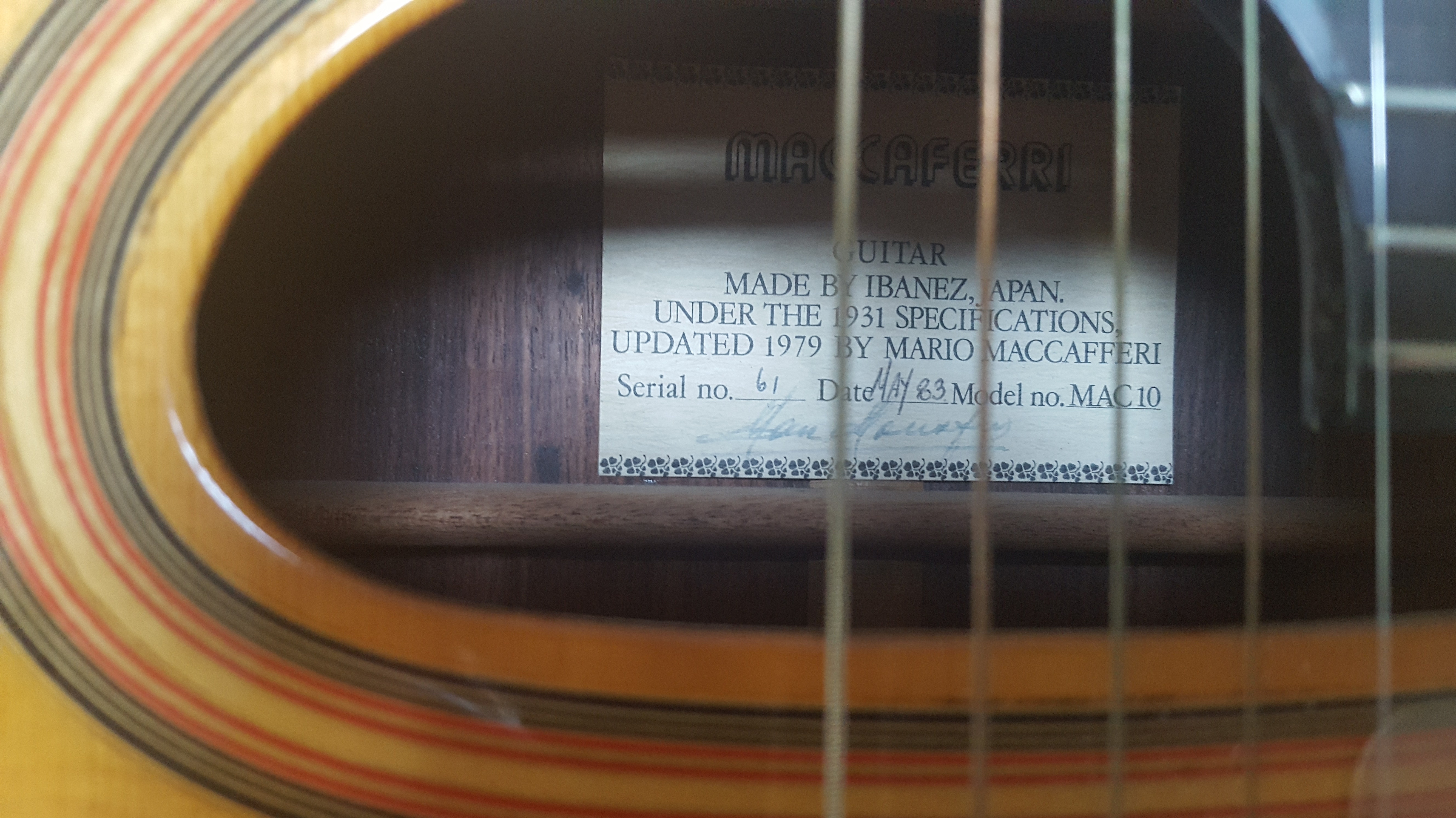 The guitar is a MAC-10. Made under licence by Mario Maccafferi in Japan in 1979-83. These guitars are very sort after in Holland. Had the guitar had a label, it would have looked very similar to the one in the photo. Including the hand written signature of the great man