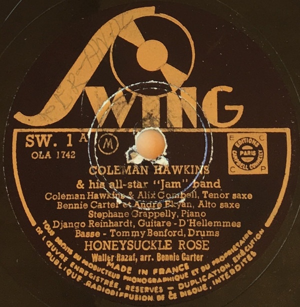 So the first photo is taken on march 1937 and not 1935. 1937 is in fact the date of the second venue of Coleman Hawkins and date of the arrival in Paris of Marcel Bianchi that recorded with the HCQ in 1937 taking a banned Joseph Reinhardt's place for monthes. Charles Delaunay at this time also created his own record company "Swing" and the first record SWING Nr 1 that ever was recorded had to be Coleman Hawkins Orchestra with Combelle, Carter, Ekyan and Django: A very important document showing that french jazz wasn't late in those years.