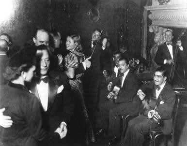 The second photo is a classical Quintet one with Louis Vola on Bass behind a big cymbalum with a front line formed by Stéphane Grappelly on violin, Eugène Vees, Django, and Joseph Reinhardt. In both photos the statues adorning the big fireplace are clearly visible. Probably the woodfloor and the boxed ceiling gave a sufficient acoustic volume to the orchestra to play without any amplification. Date could be late 1936 as Joseph Reinhardt is still present.