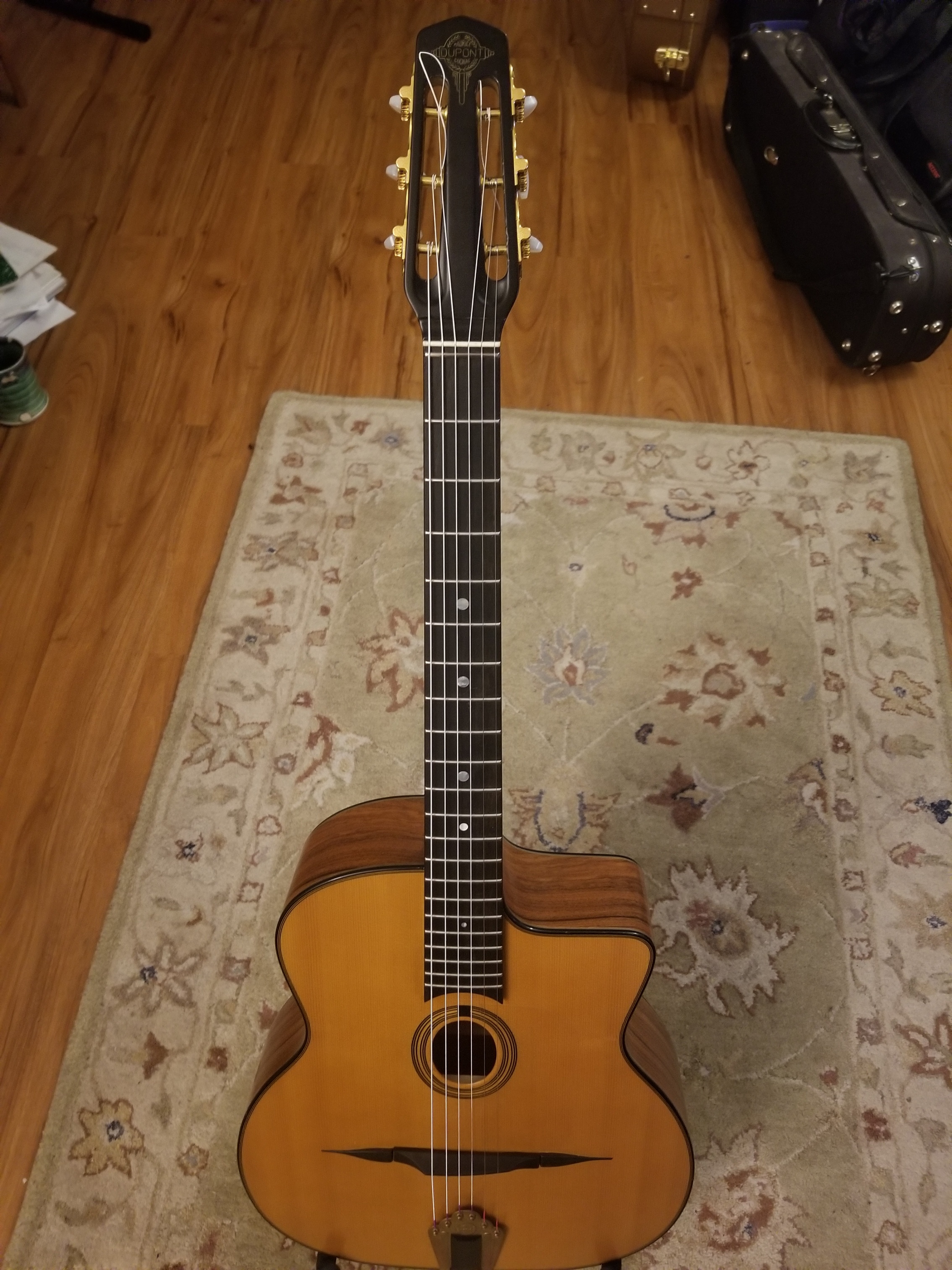 Hi! I'm selling this wonderful Dupont guitar, exquisite craftsmanship, beautiful tone woods! I've had the pleasure of playing a dozen gigs with it over the past months. I'm a rhythm guitarist in my gypsy jazz band, and also a bluegrass musician, so I'm naturally gravitating toward D-hole guitars. Take this opportunity to purchase a preowned Dupont at a reduced price!