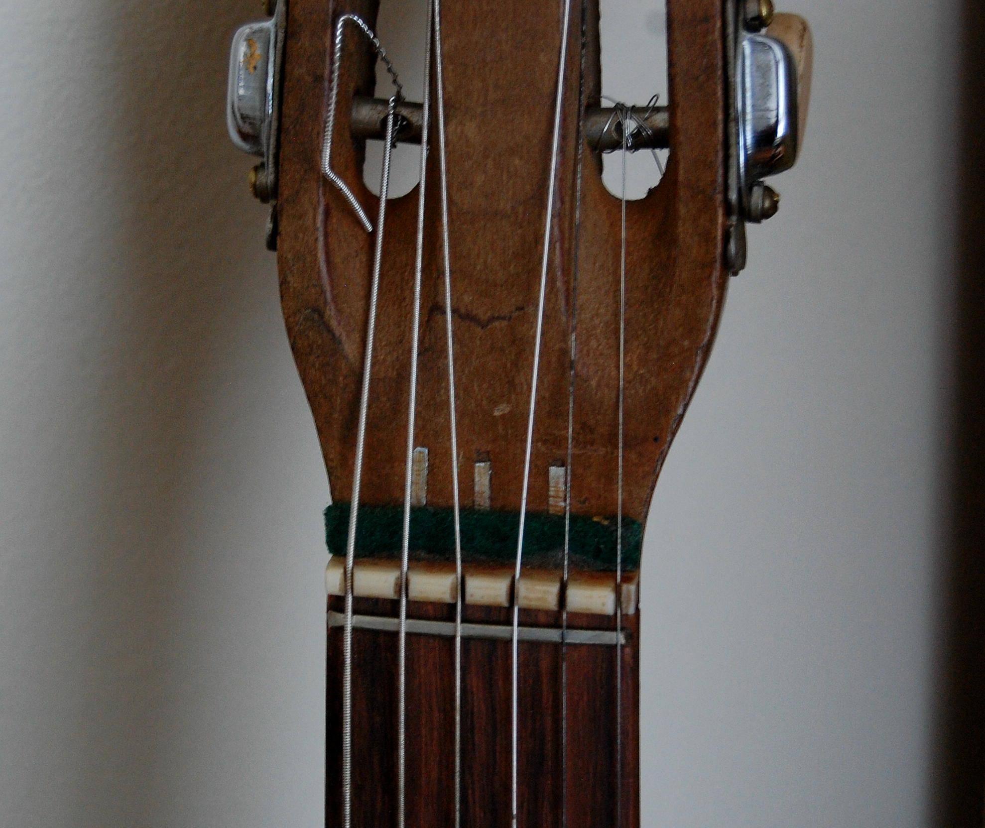 The only way I know there are three thin aluminum rods in the neck of this Di Mauro is because the ends are visible extending a short way above the nut.