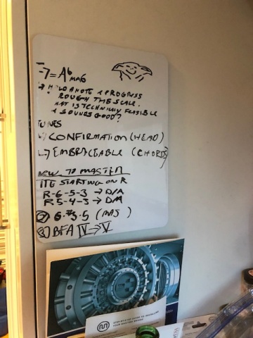I have two areas that I generally focus on daily. One is my dry erase board, which is stuff I am working on during this period. If I feel like I've played the heck out of it and I'm hearing it in my sleep, I send the idea to a new home. The new home is one of several bound books of ideas that I revisit every so often to refresh ideas, especially after a crappy gig. Discard my crappy handwriting or what I'm working on.It's my shorthand.