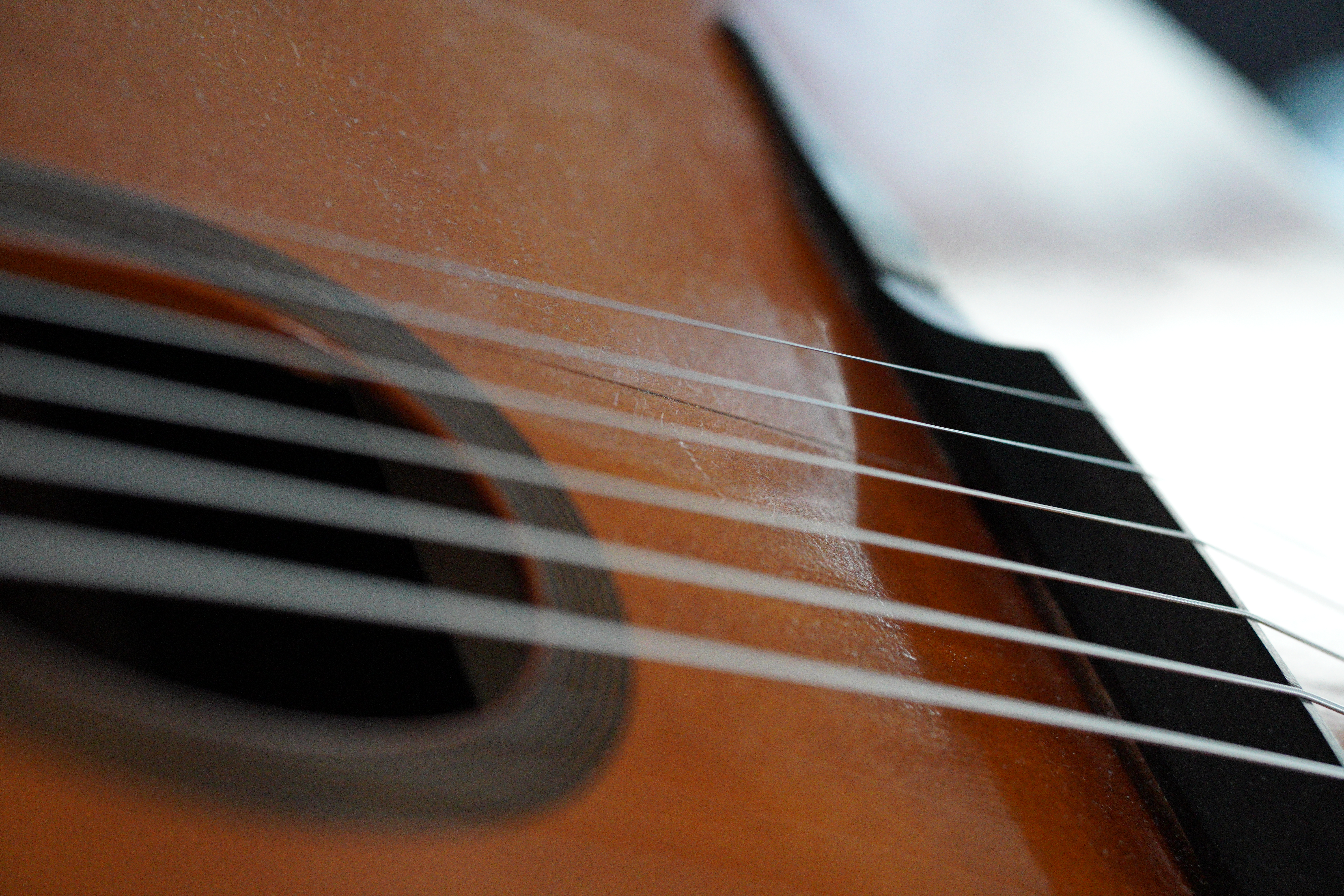 The pick guard is only seen if the light hits it just right, but protects from scratches (though I wish I had adjusted it's placement based on my picking). The cream polish helps add back a bit of finish that I wear off with picking, keeping my guitar looking as close to new as possible. Honestly, you'd be able to see the pick-wear much more easily if I didn't use the cream polish every time I swap strings.