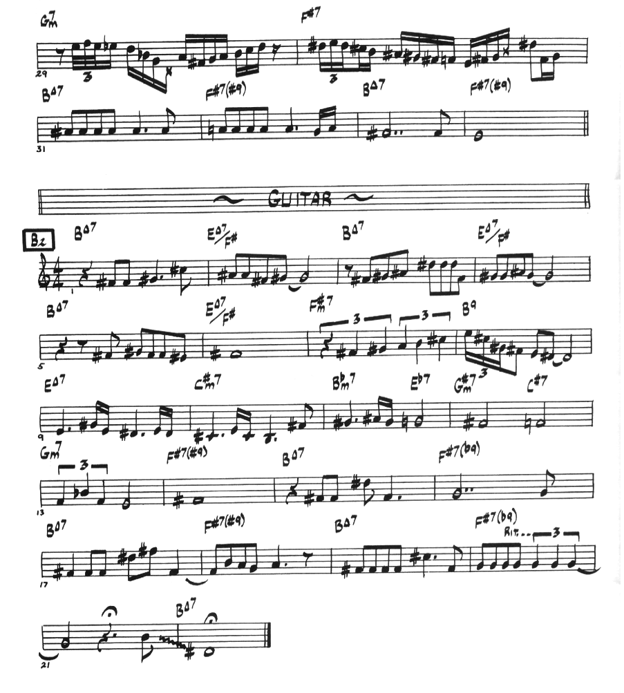 Wow, beautiful chords! Thanks for the transcription! I like the refreshing changes in bar 13 and bar 27-29 although it's the Bassline that connects these changes, so you've got to add bass notes to the (whole) transcription to make it work! In bar 29 of the transcription i do hear gm7 followed by C7.