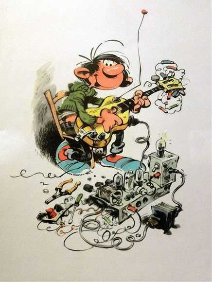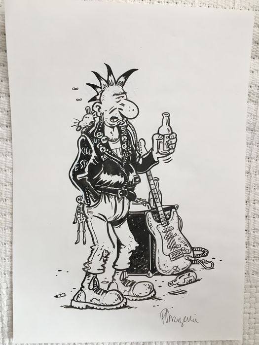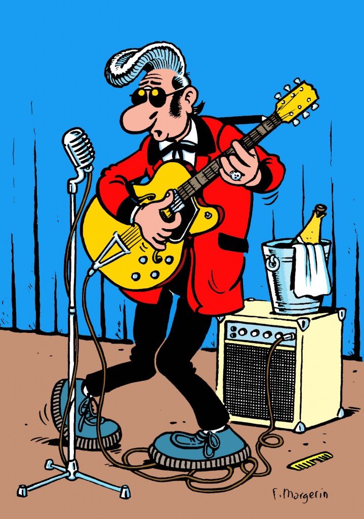 Another french Illustrator with much music in his work is Frank Margerin, born 1952. While Sempé's drawings show a more conservative urban scene with people playing piano, violin and other orchestral instruments, Margerin's staff consists of suburban punk and rock'n'roll addicts: