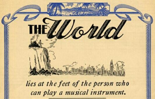 You have to look closely: the person who has the world at her feet has a guitar (what else!).