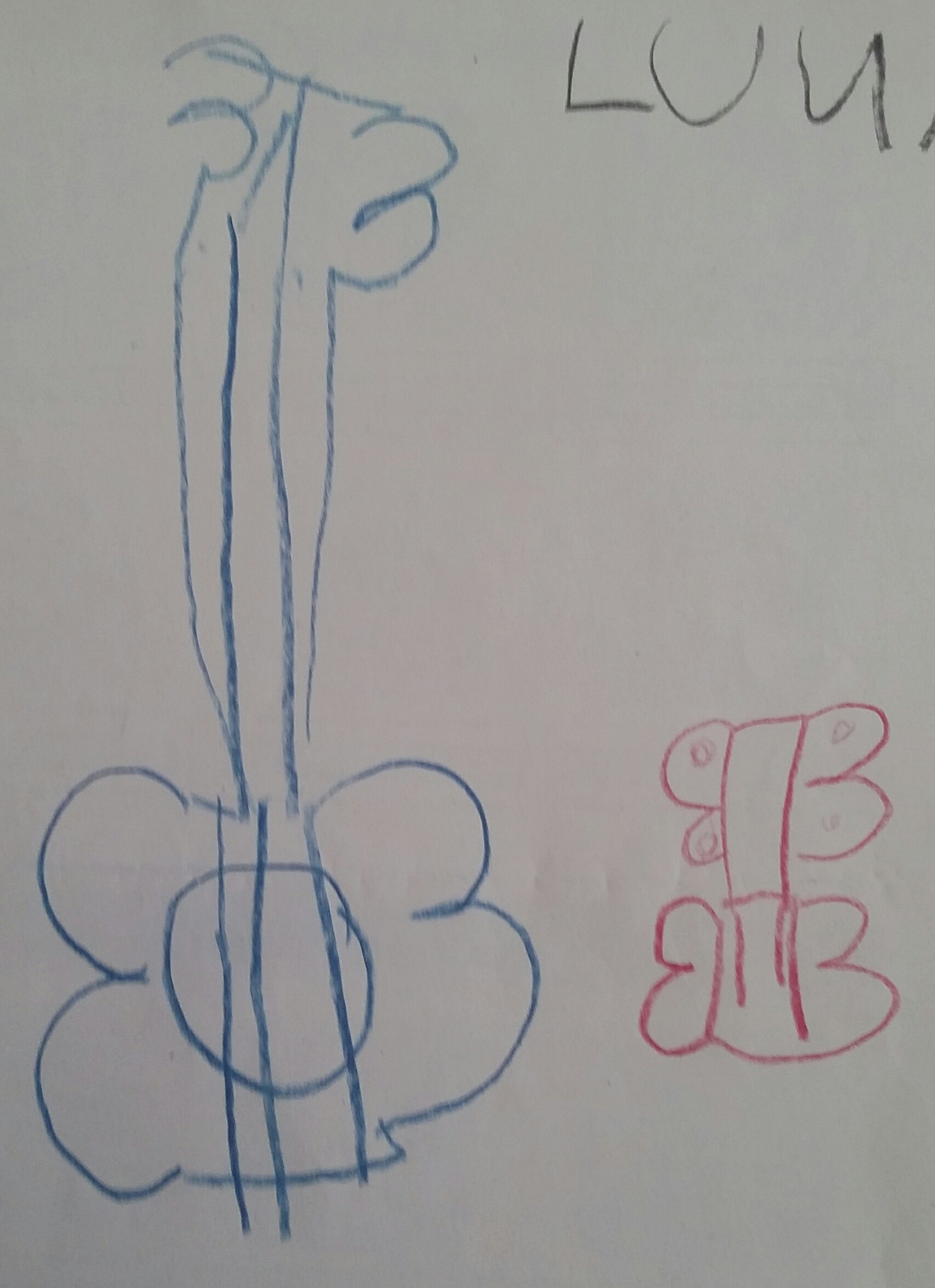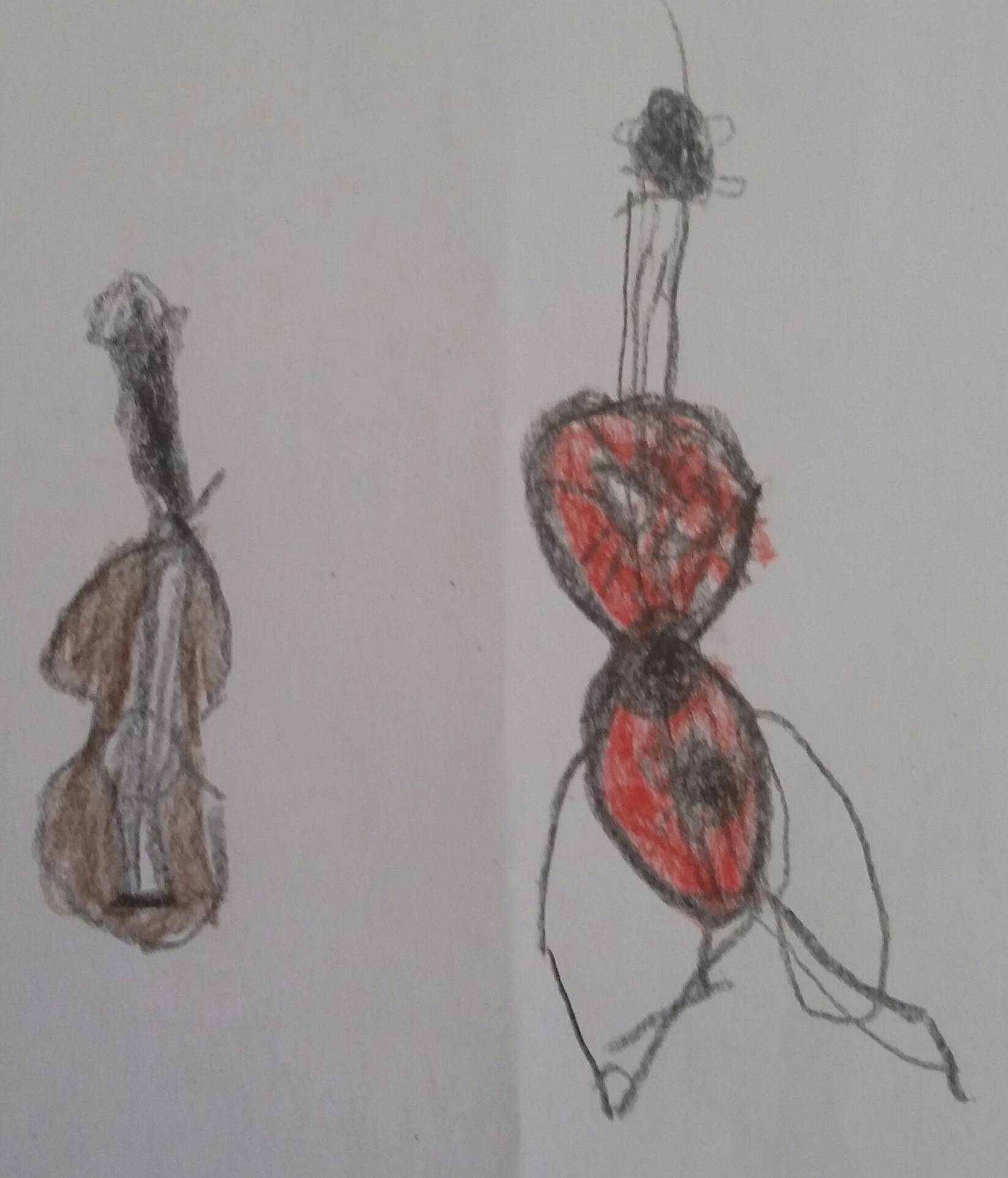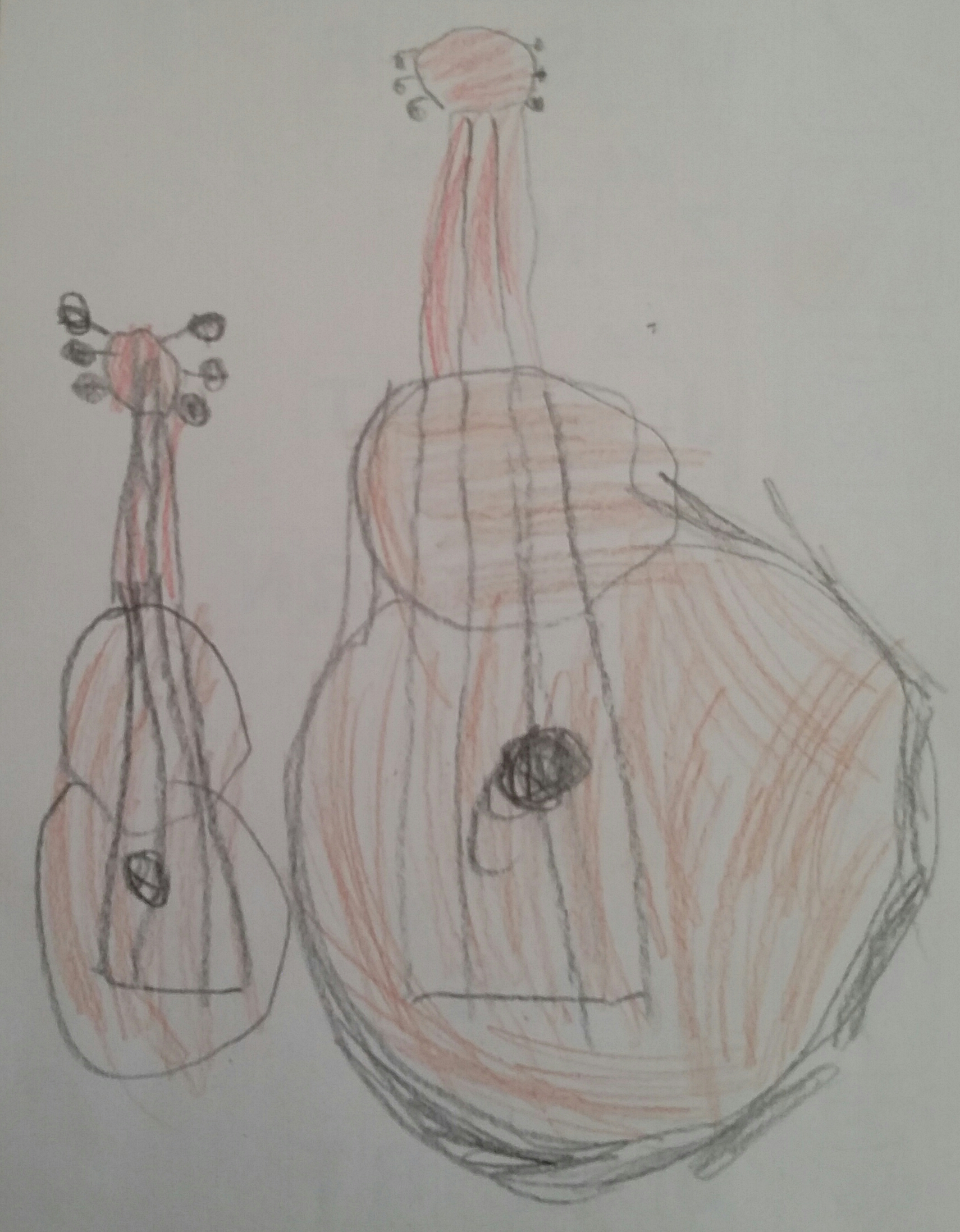 New preschool class, new drawings. We discussed differences and similarities of a tenor uke, a baritone uke, a classical guitar and an acoustic bass. The 5 and 6 year old children then made drawings of the instruments.