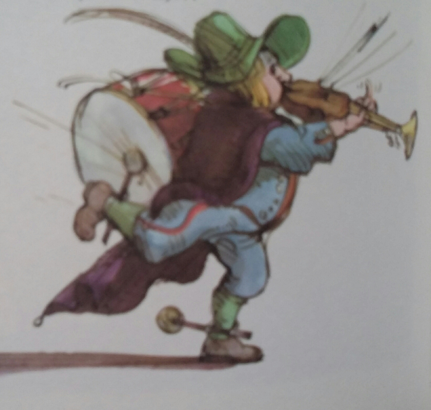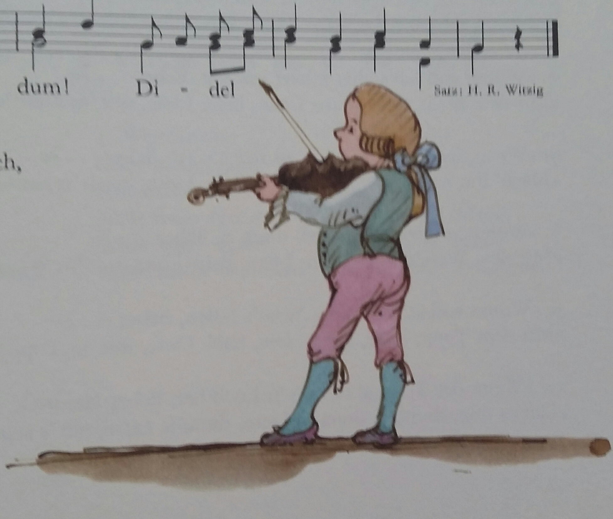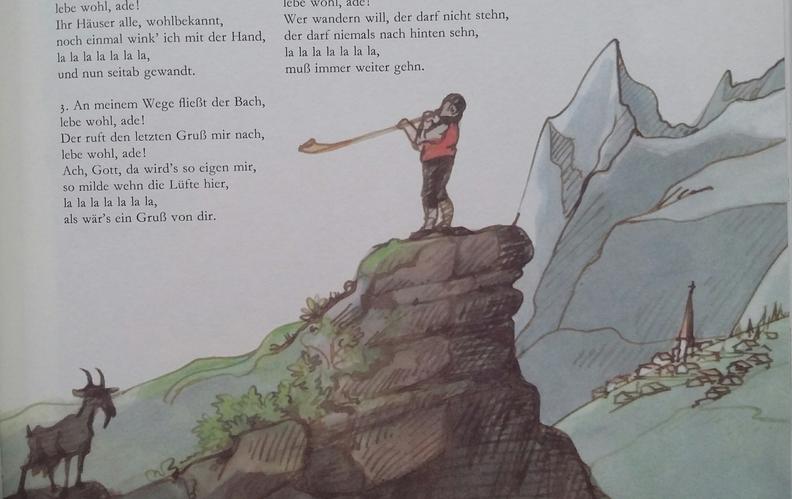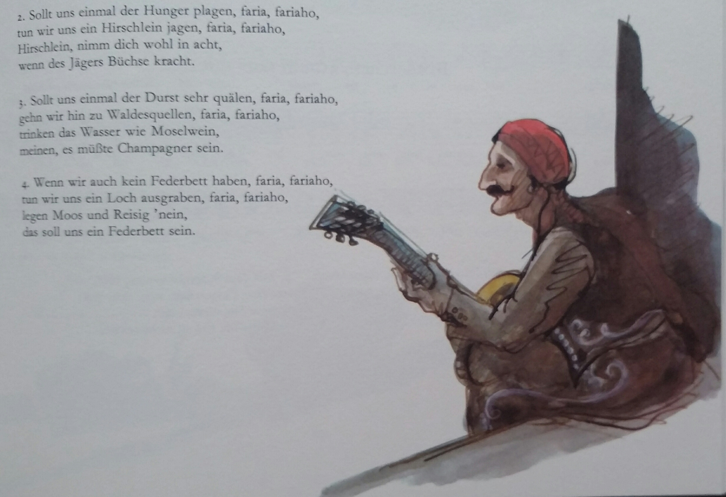 And I appreciate that as an illustrator he dares to go against the lyrics as shown by the fiddler with the factory in the background ("Hans Spielmann stimme deine Fiedel") or the gypsy guitar player and the caravan ("Lustig ist das Zigeunerleben") above.