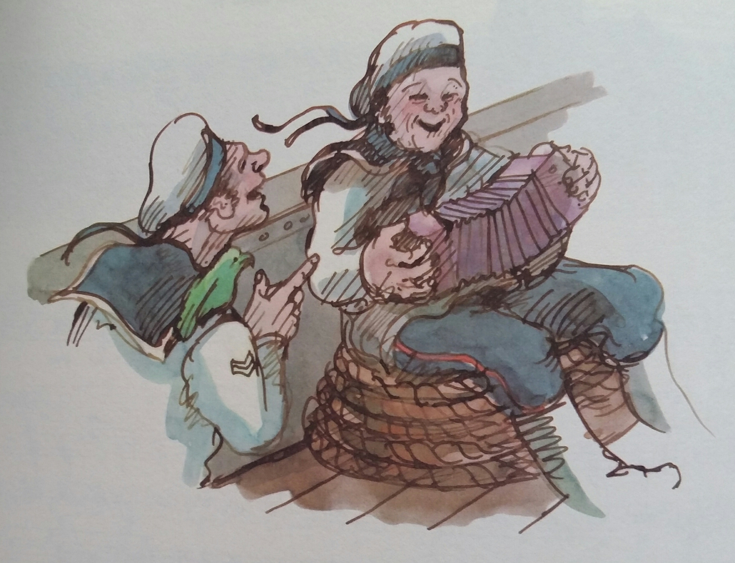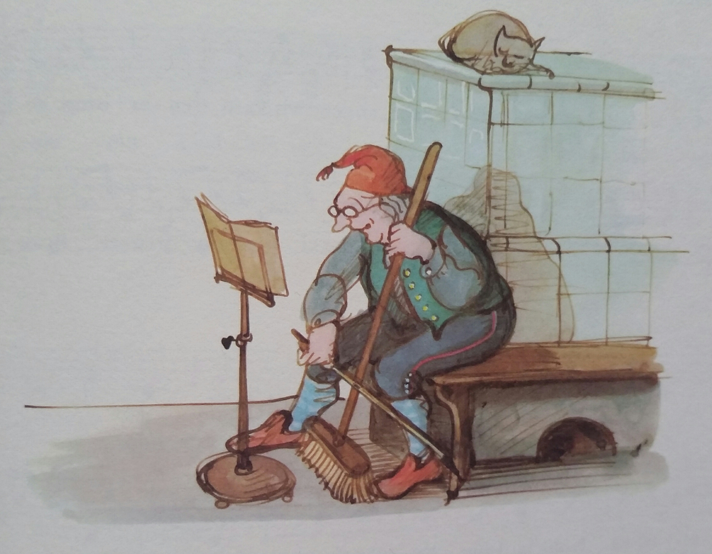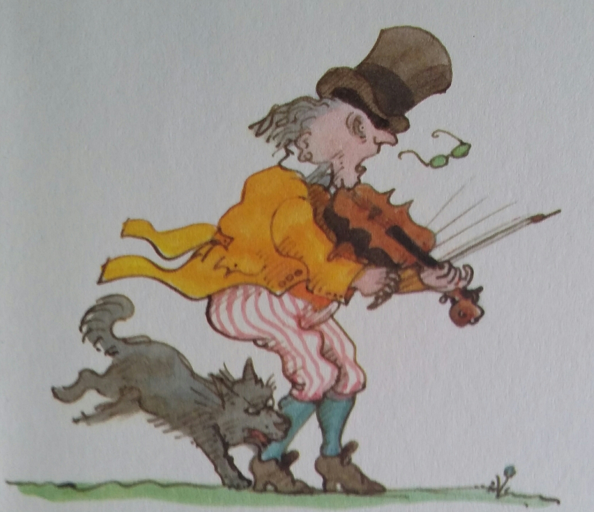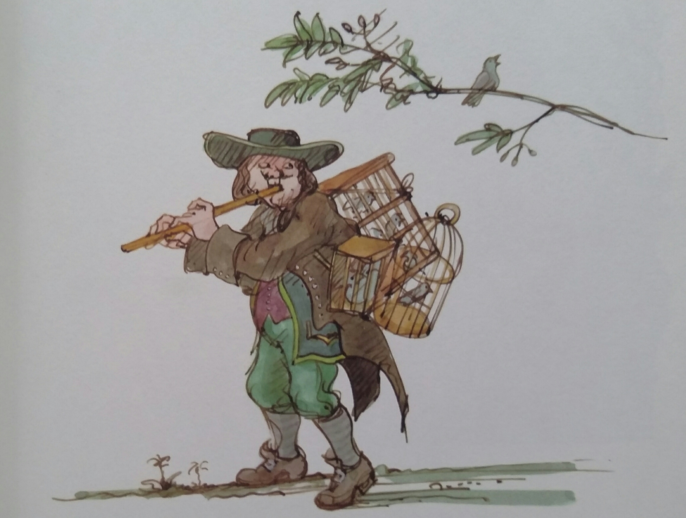 And I appreciate that as an illustrator he dares to go against the lyrics as shown by the fiddler with the factory in the background ("Hans Spielmann stimme deine Fiedel") or the gypsy guitar player and the caravan ("Lustig ist das Zigeunerleben") above.