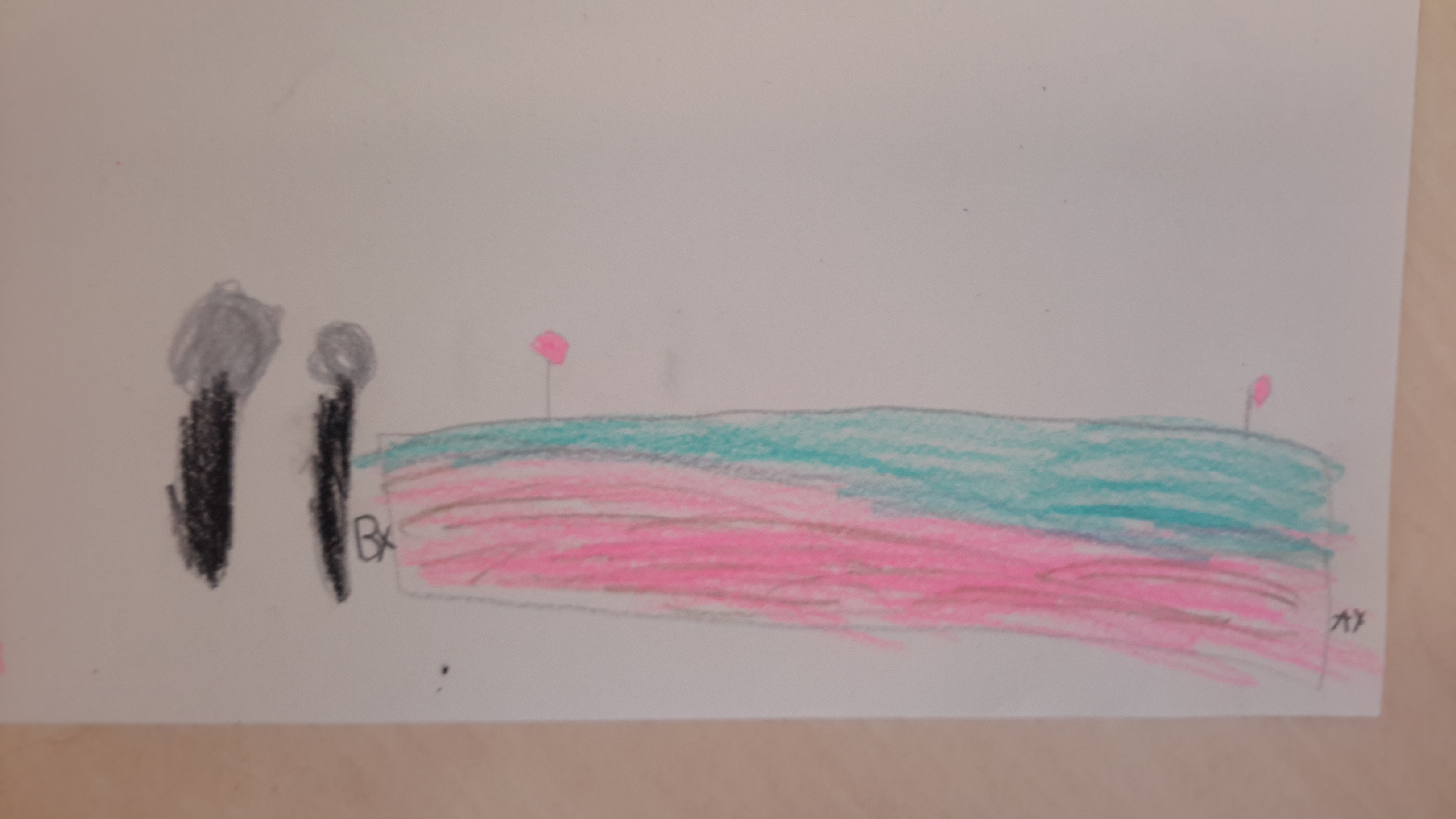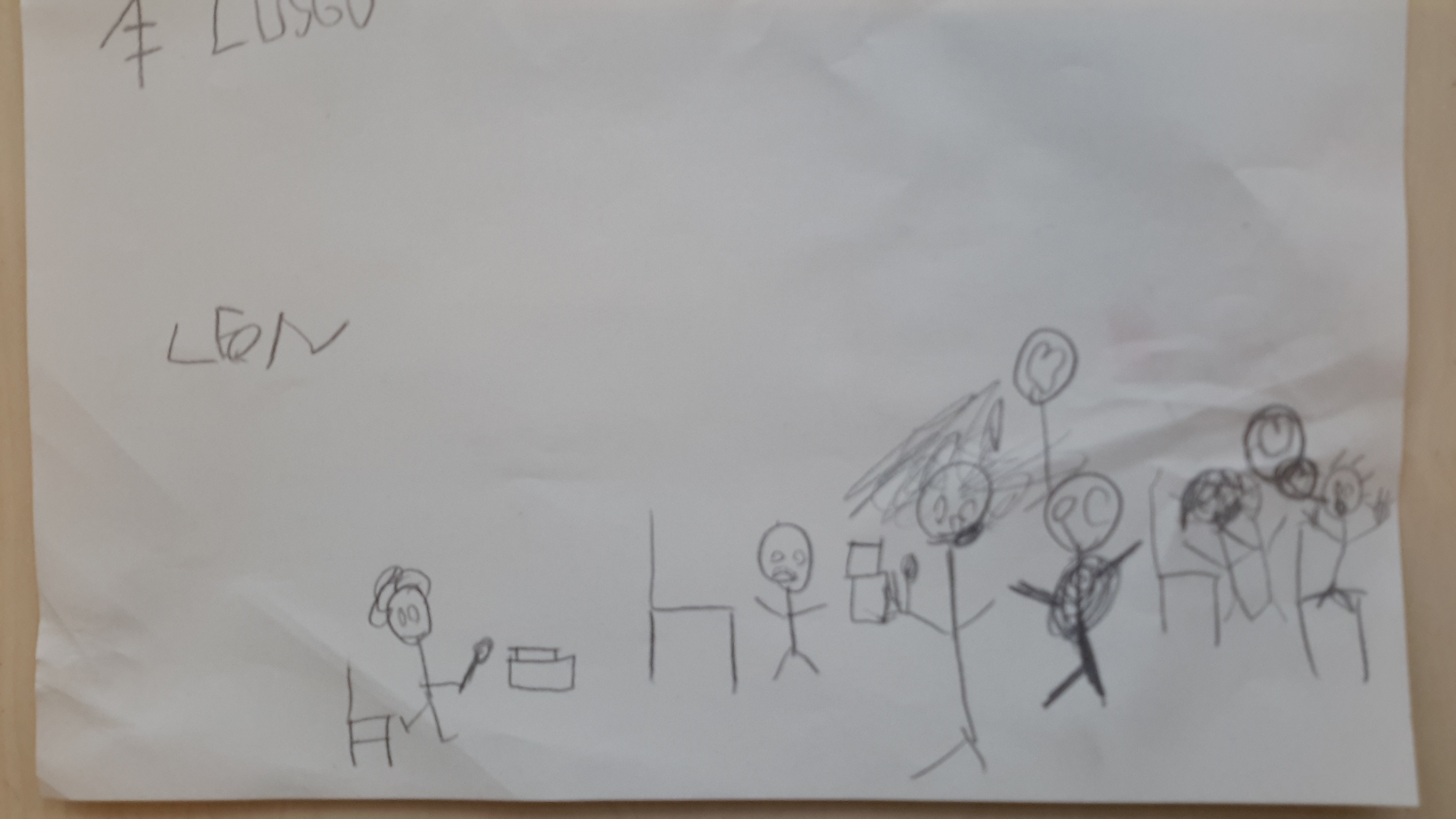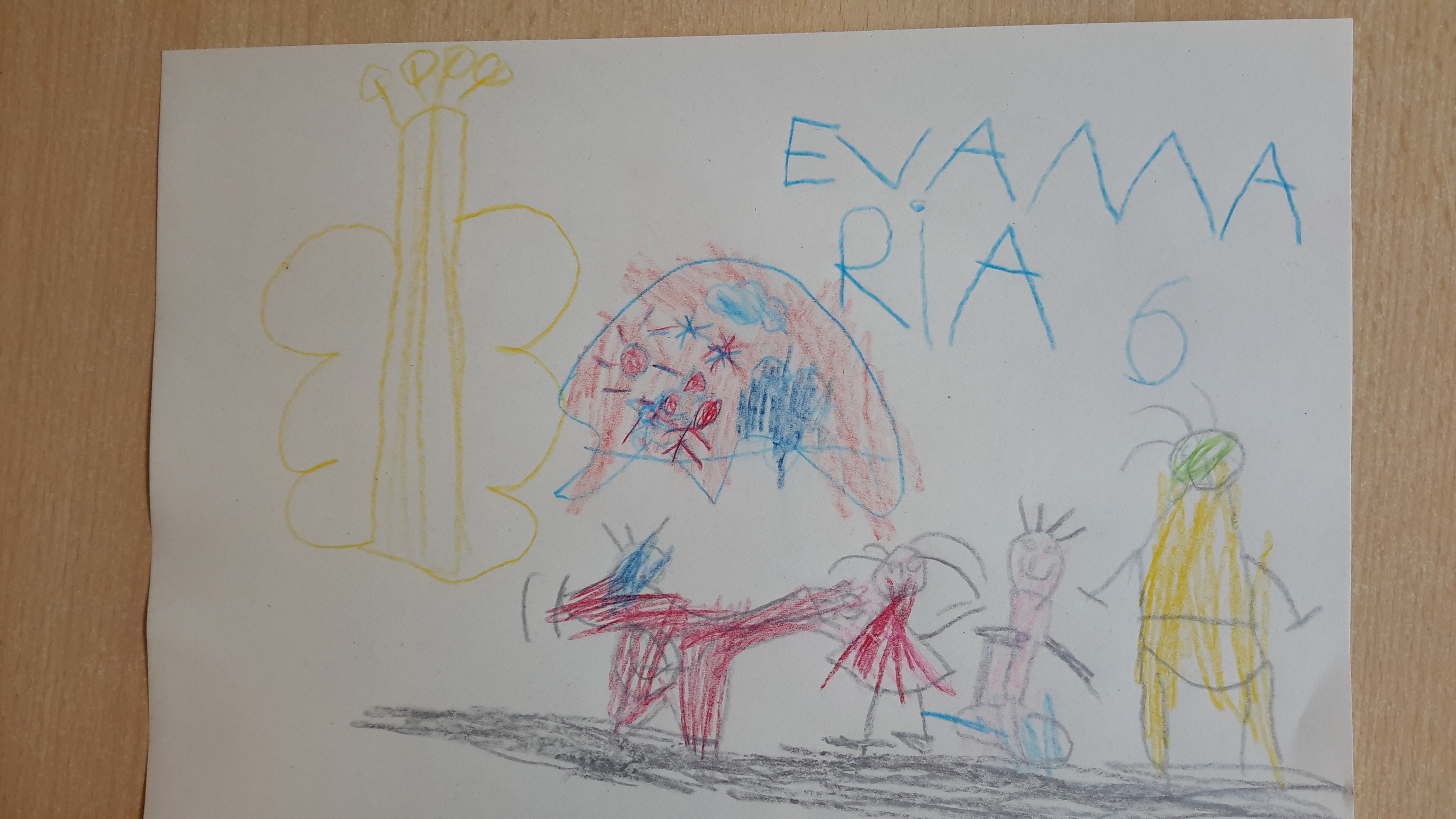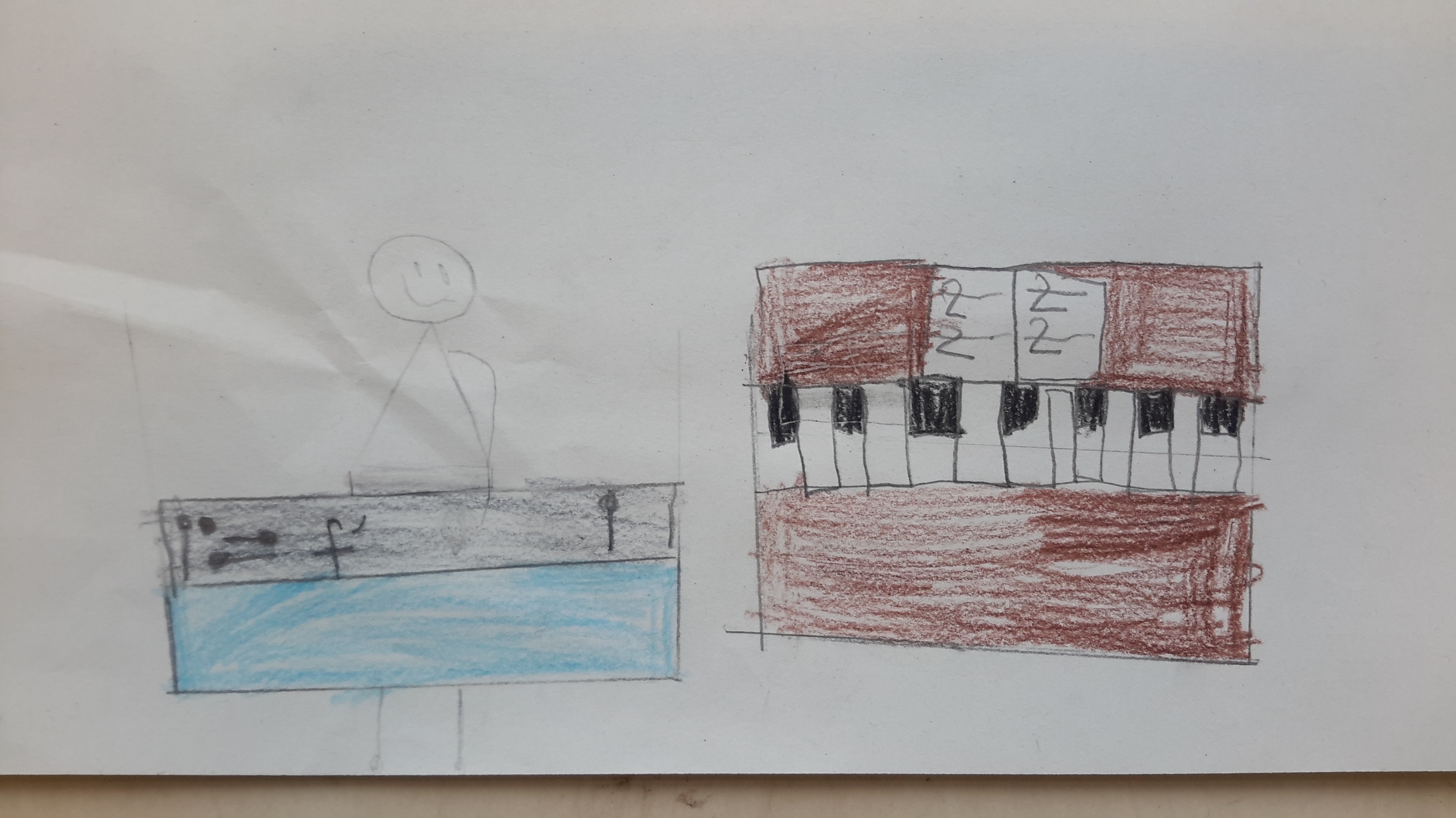 Malak, playing the big chime bar next to the piano (which did NOT stand there, she drew the piano from memory).
