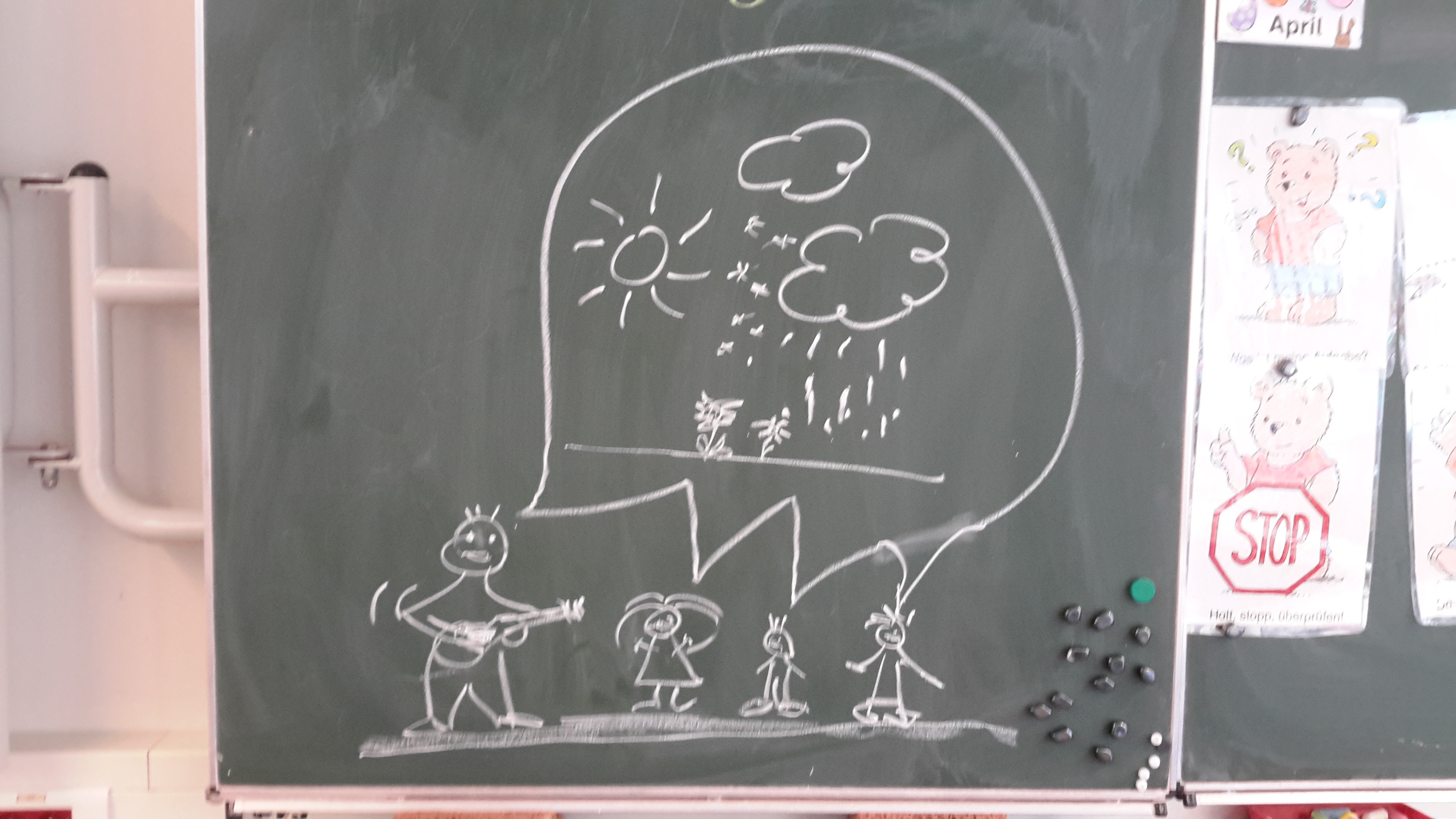 Today we sang "I like the flowers" with one of my preschool classes, then drew what we had sung and what came to our minds concerning "spring". The german lyrics are different from the english version: no flowers, daffodils, mountains or rolling hills, but the sun shining, and the expectation of more warm and less winterly weather. No problem for most of our preschool kids; for those who hesitated taking the pencils I made a (very) quick drawing to help them in.