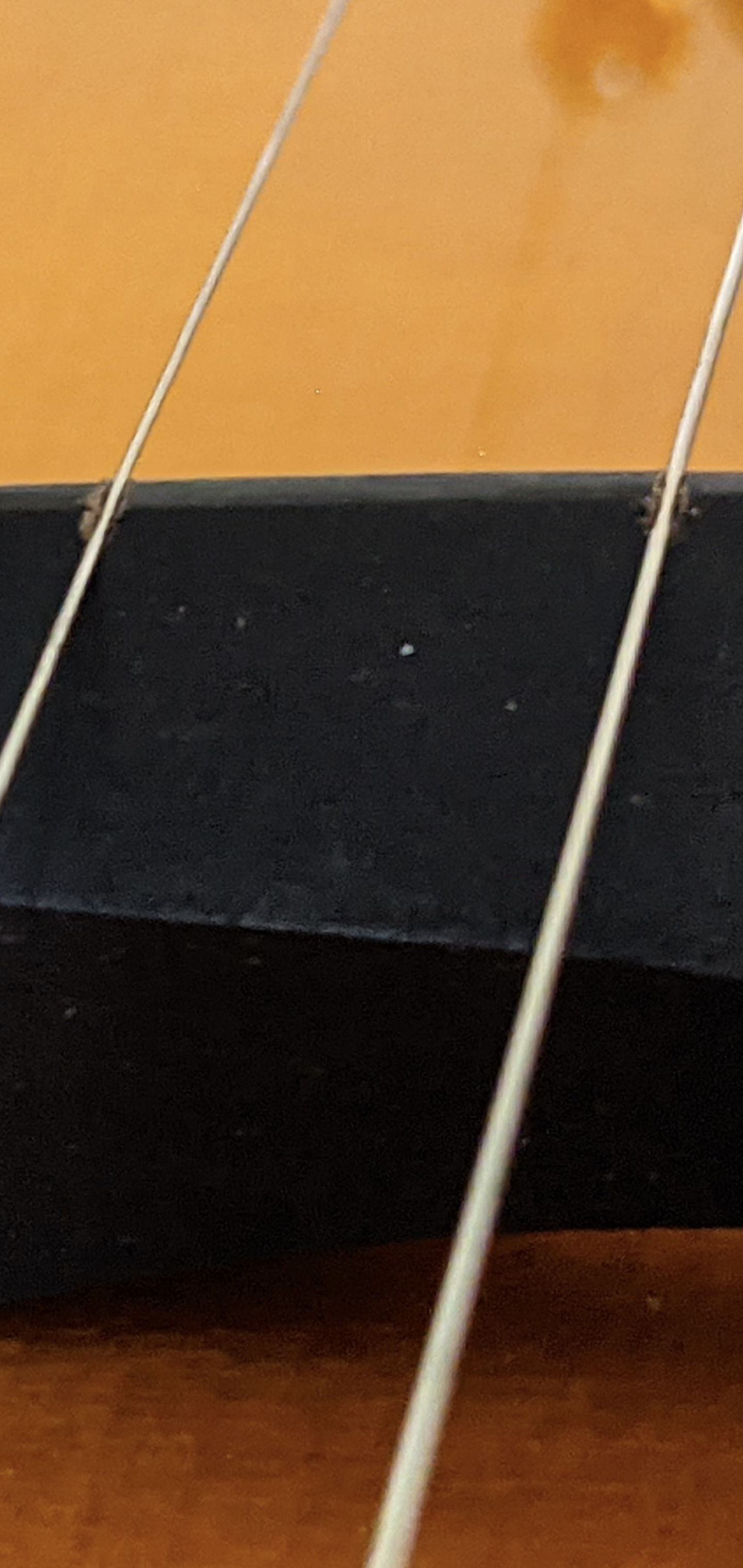 Also the slots in the bridge for the strings seem to be quite deep, especially the b and e. I believe the tone of the e string is suffering because of this. Does it look off? The strings pictured sit lower than the tip of the bridge. Looks terrible to me. I think the guitar would benefit from a new bridge.