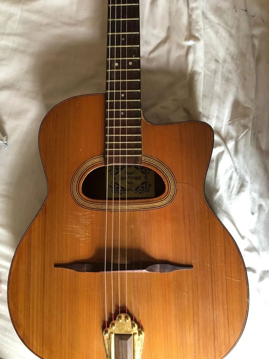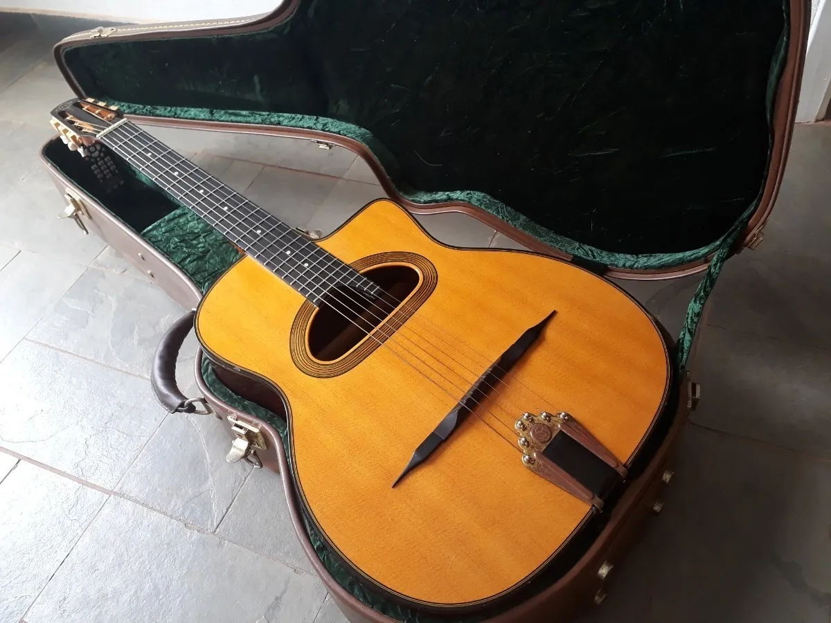 1- Pierre Fontaine, reportedly bought in the Paris, Rue Rome shop a few years ago, built late 90s or early 2000s, heavy play wear, appears cosmetic only, needs a setup to lower the action (a little concerned as it doesn't seem to have a truss rod and I'm not looking for a 'project guitar'). Having said that, I've got a good feeling about this one! ;)