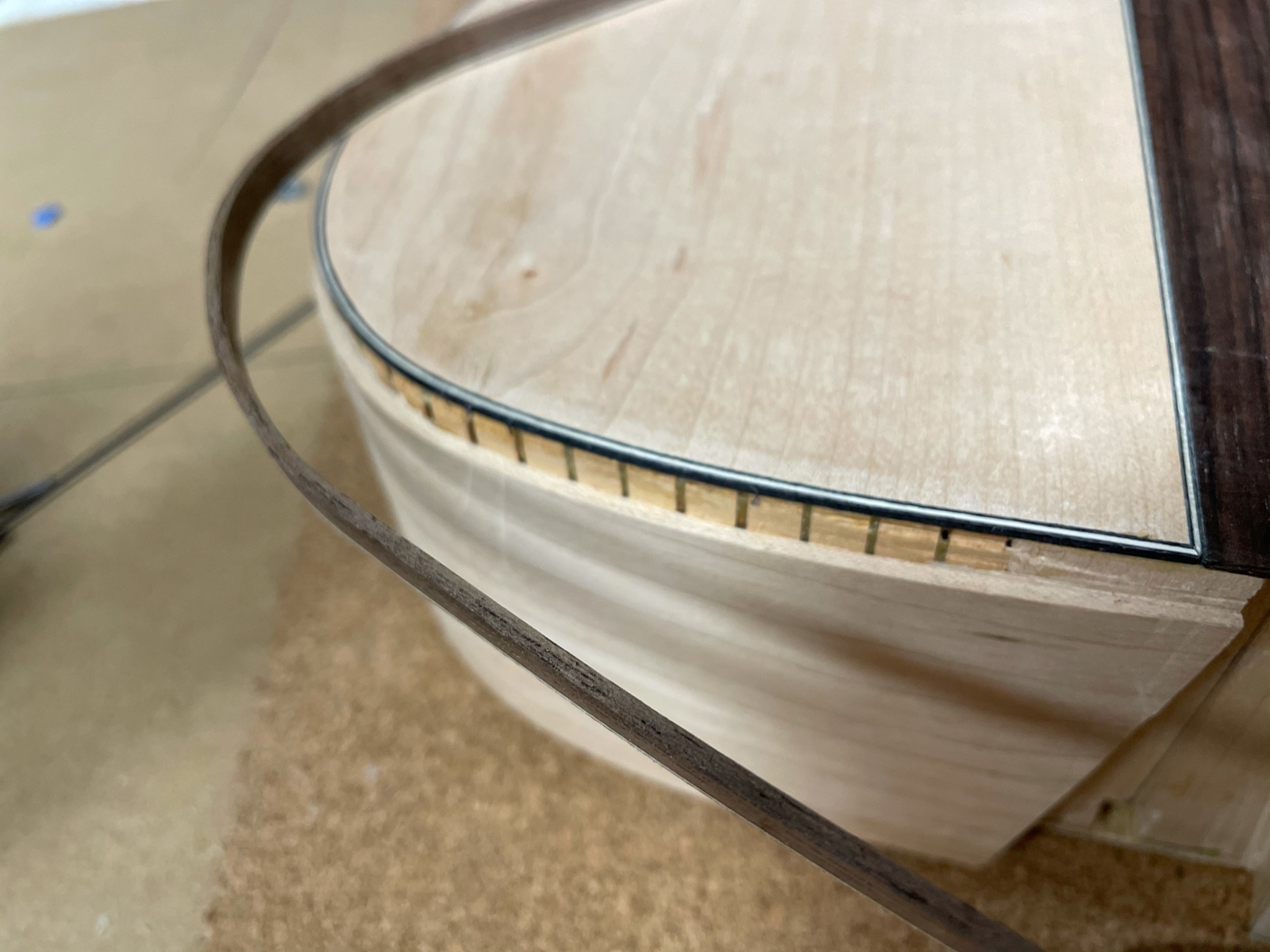The top/sides are domed and there is no pliage. For the top I used a 15’ radius dish on just the lower bout. The bracing was finished off on the same radius dish to get arches that work with the doming of the sides.