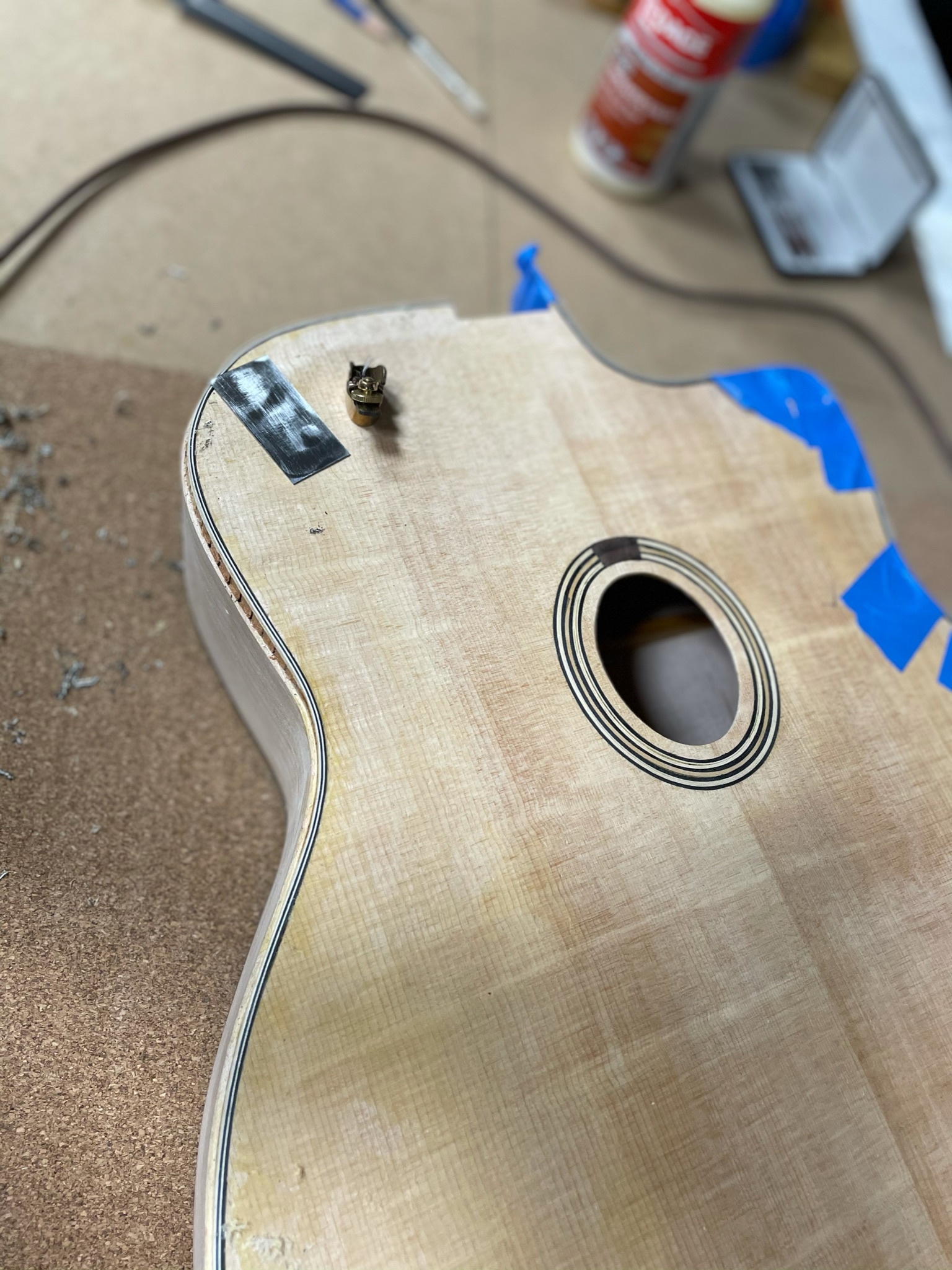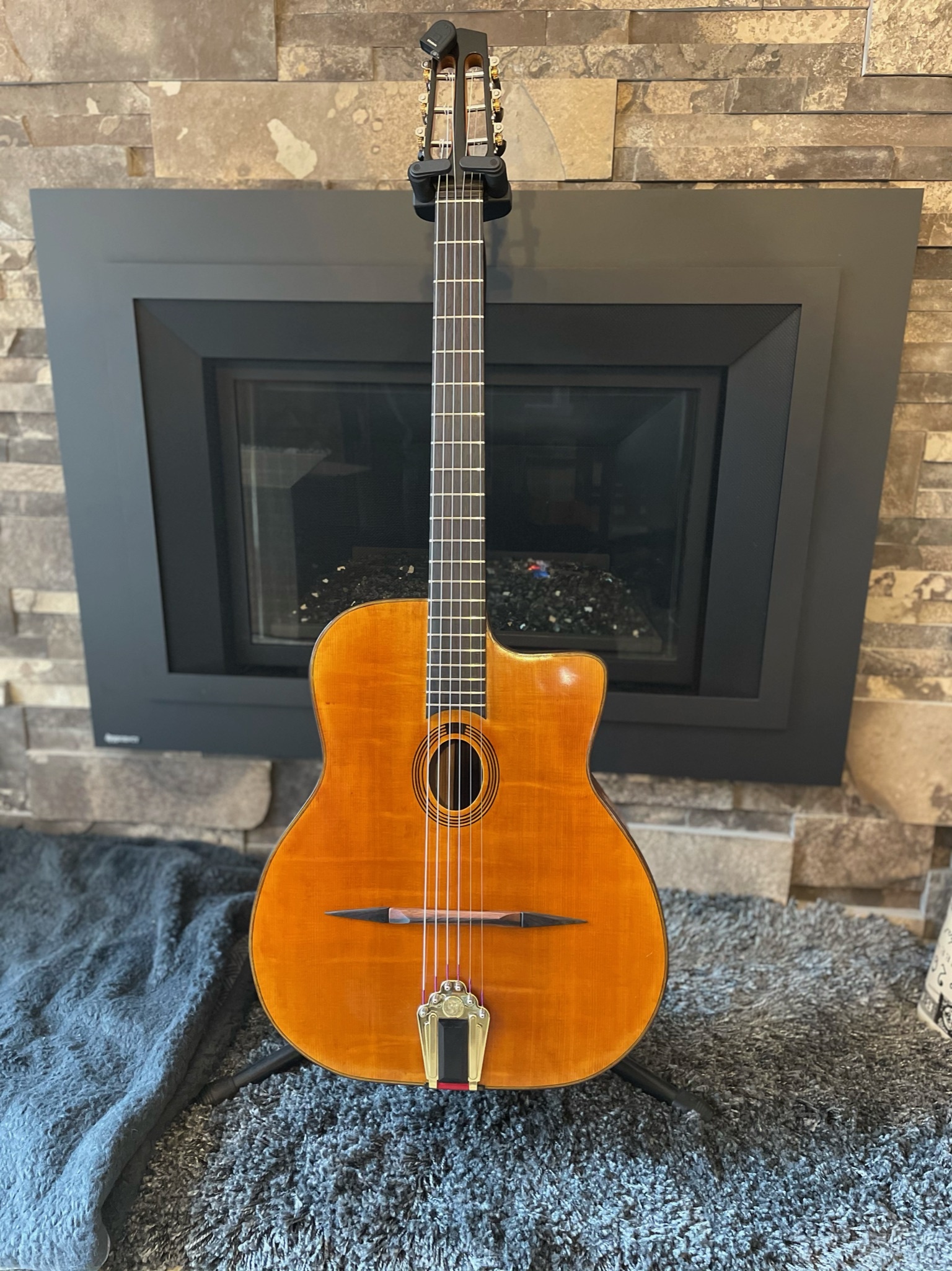 The total weight of this guitar strung up is 1920 grams, and my Gitane Stephane Wrembel is 1906 grams for comparison, so very close. The top was about 230 grams before it was trimmed when glued to the body. This heavier than I wanted but I didn’t want to take more off the braces after I tuned the top.