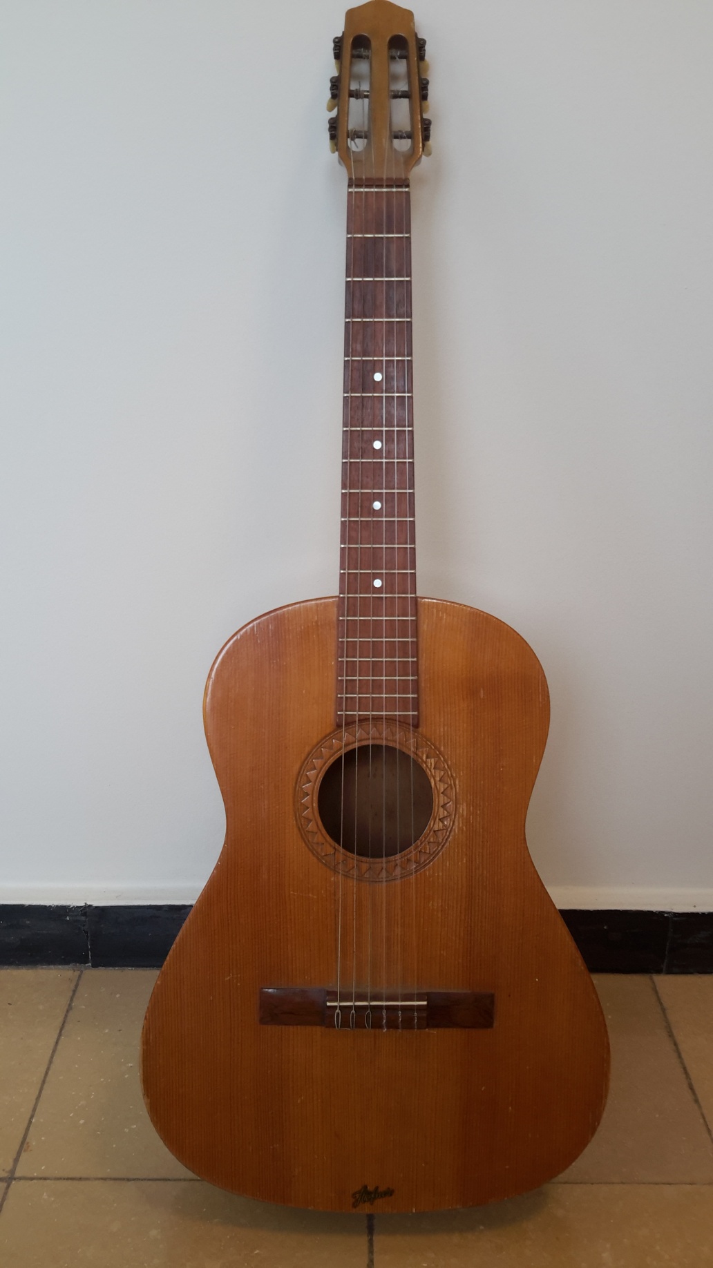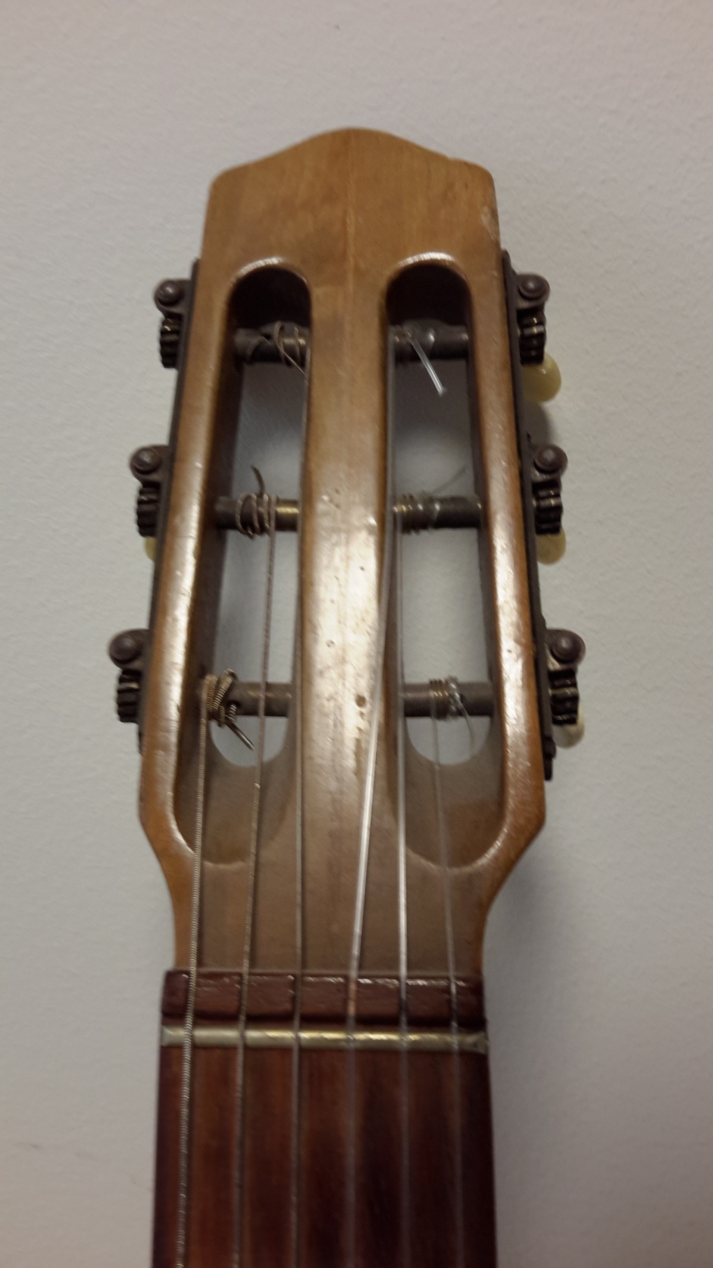 The playability of the guitar from our basement is quite o.k., even with the rather old strings attached on it. I will restring it with Thomastik Infeld Steel strings for classical guitar; I'm curious, if the instrument will turn out to be a real gipsy. A collegue has brought a set of KR 116 rope core, but I'm afraid this will kill the guitar, the top has a crack already. So I have to wait for a set of KR110 - if successful, the result can be seen and heard here shortly.