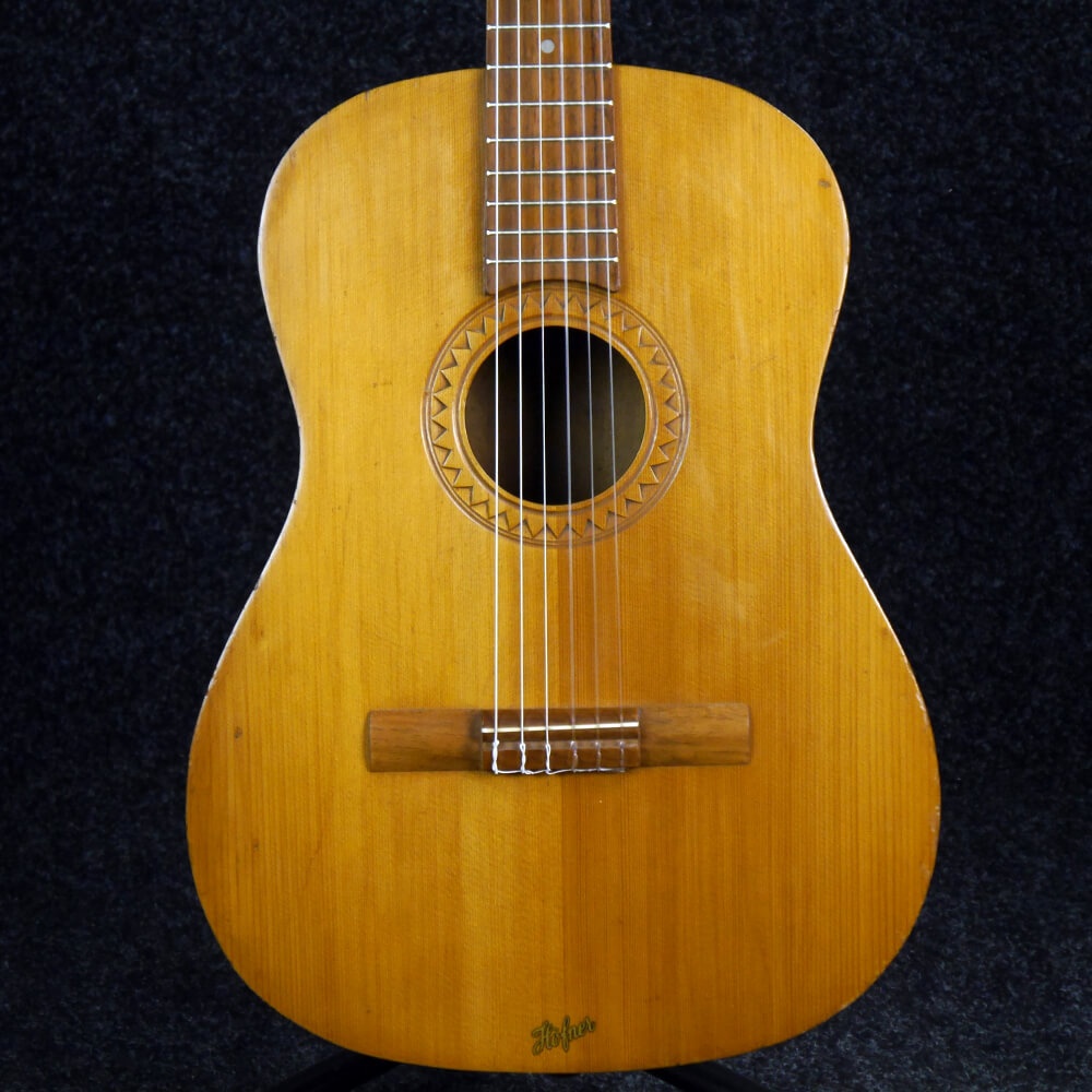 Hello everybody, I found an old Höfner guitar in the basement at our school, obviously not played that much for a long time: covered with lots of dust, a dead spider inside. The school was built in the 50ies, maybe it's one of the first instruments that were bought back then. It has a zero fret, a slightly arched back and a "gipsy" headstock, but a classical tailpiece. And a carved rosette. Does anybody know similar Höfners?