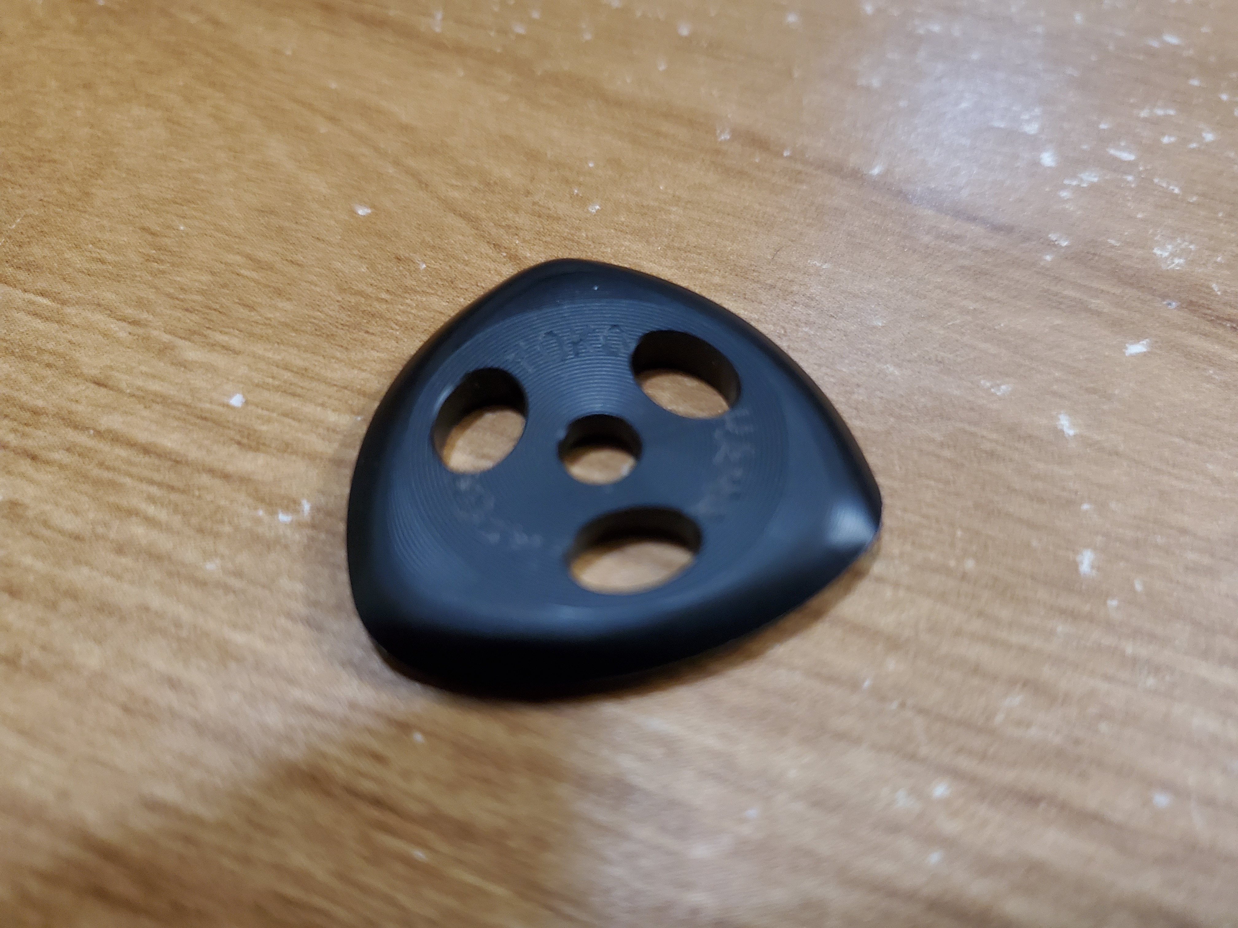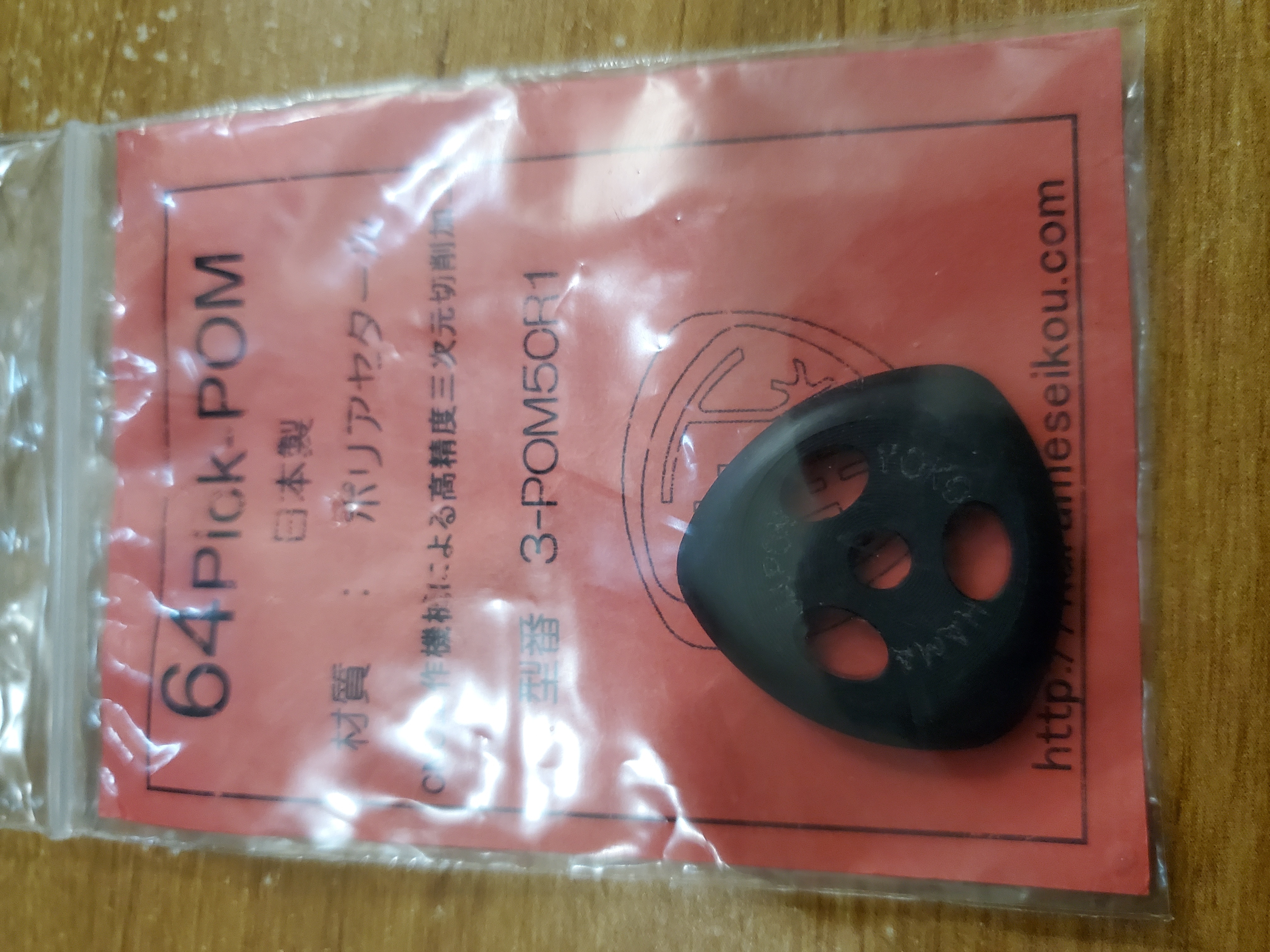 Pick is 3.0mm. It's too small for me -- small triangular -- but the design is revolutionary, and plays like butter.