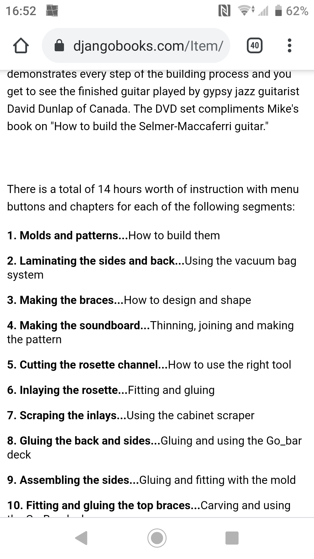 The book is nicely printed and packaged across 4 very slim volumes, and is ideal for someone who wants a general overview of the process. It is missing, however, all the important details regarding the various molds and jigs which are required to build such an instrument. Volume 2 has 1 photo each of these necessary molds, some of which are not in focus, and from a single perspective. Some molds have welded metal parts joint with wooden frames, others are transparent plastic, which are difficult to see what exactly the shape is. There are no templates (for the rosette jig or dovetail joint, for example).