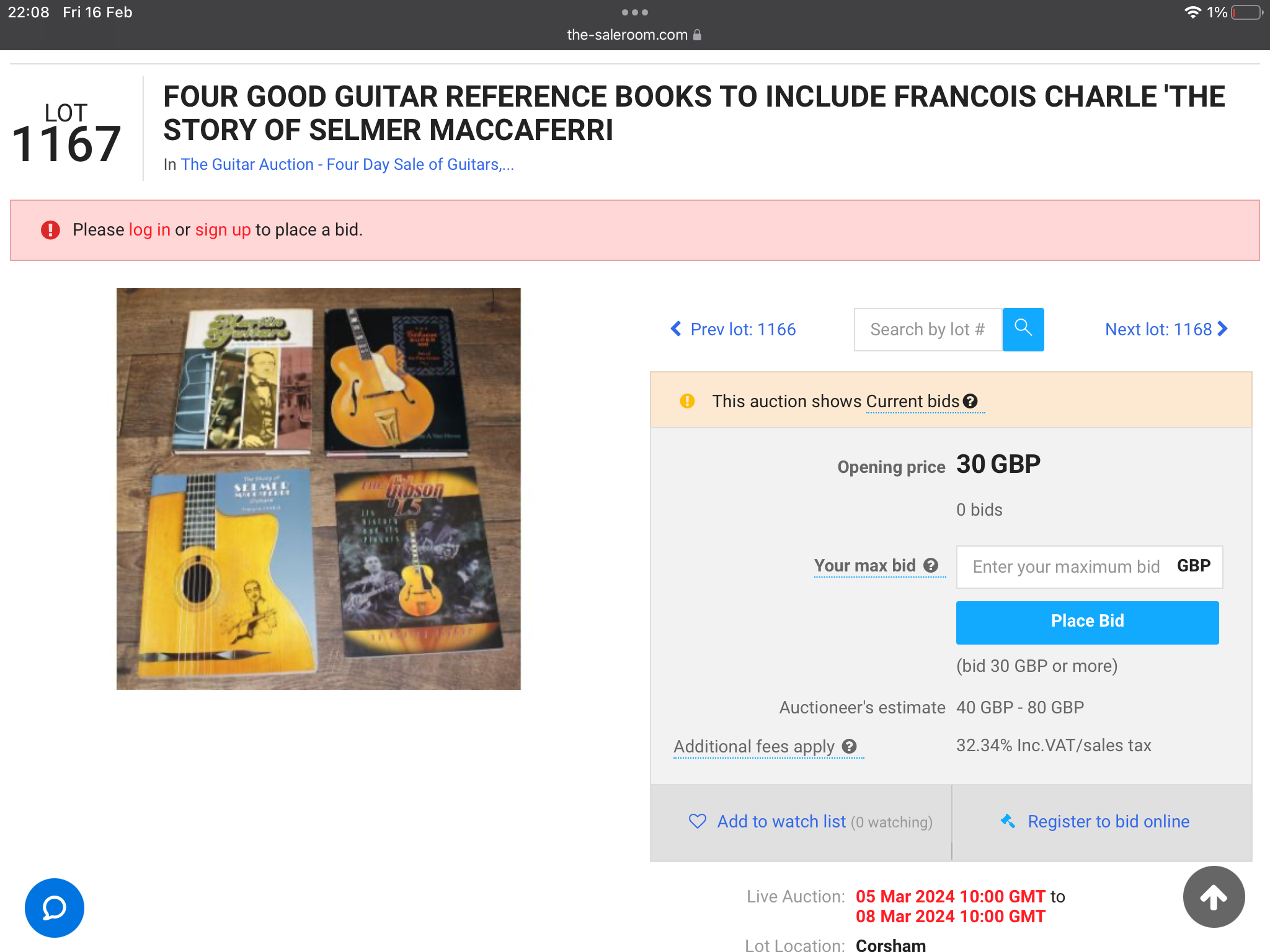 Gypsy-jazz wise, there’s nothing particularly jumping out amongst the guitars in the latest quarterly big Gardiner-Houlgate sale, but this lot has the rather rare Francois Charle Selmer book if anyone is looking for it.