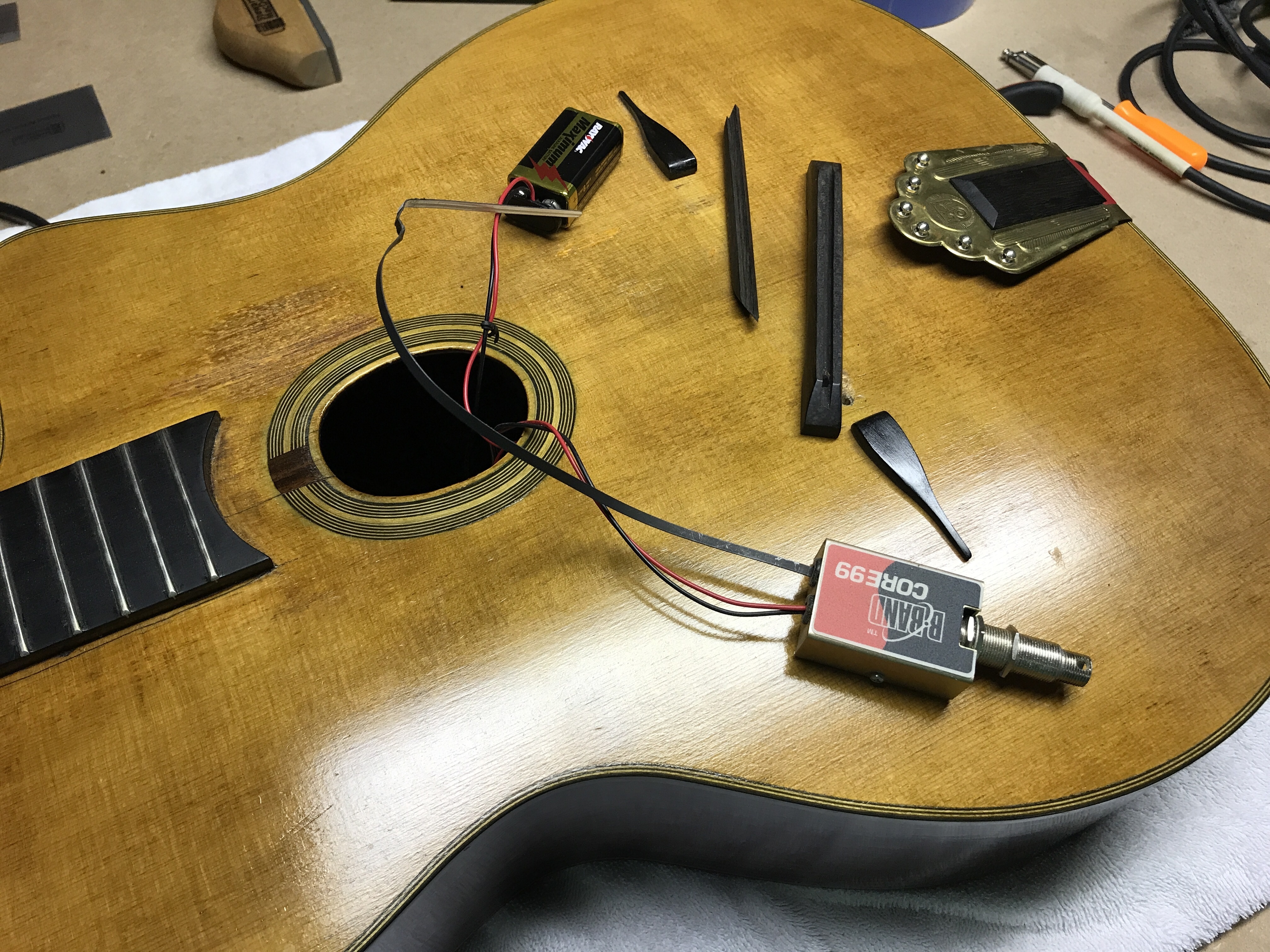 I have a 1992 Pierre Anastasio petit bouche purchased here from our friends at Django Books a long time ago, and I am only now in need of using a pickup. The current pickup is broken. It's an old B-Band Core 99 that seemed to be popular in the 90's. It was drilled through the top and up into a split bridge. Hopefully I can attach some pictures. I would fix it, but I don't think that is an option. I would need a replacement piezo strip, but these models aren't made anymore. Either way, it still just an old piezo, and tech has at least improved somewhat = opportunity.