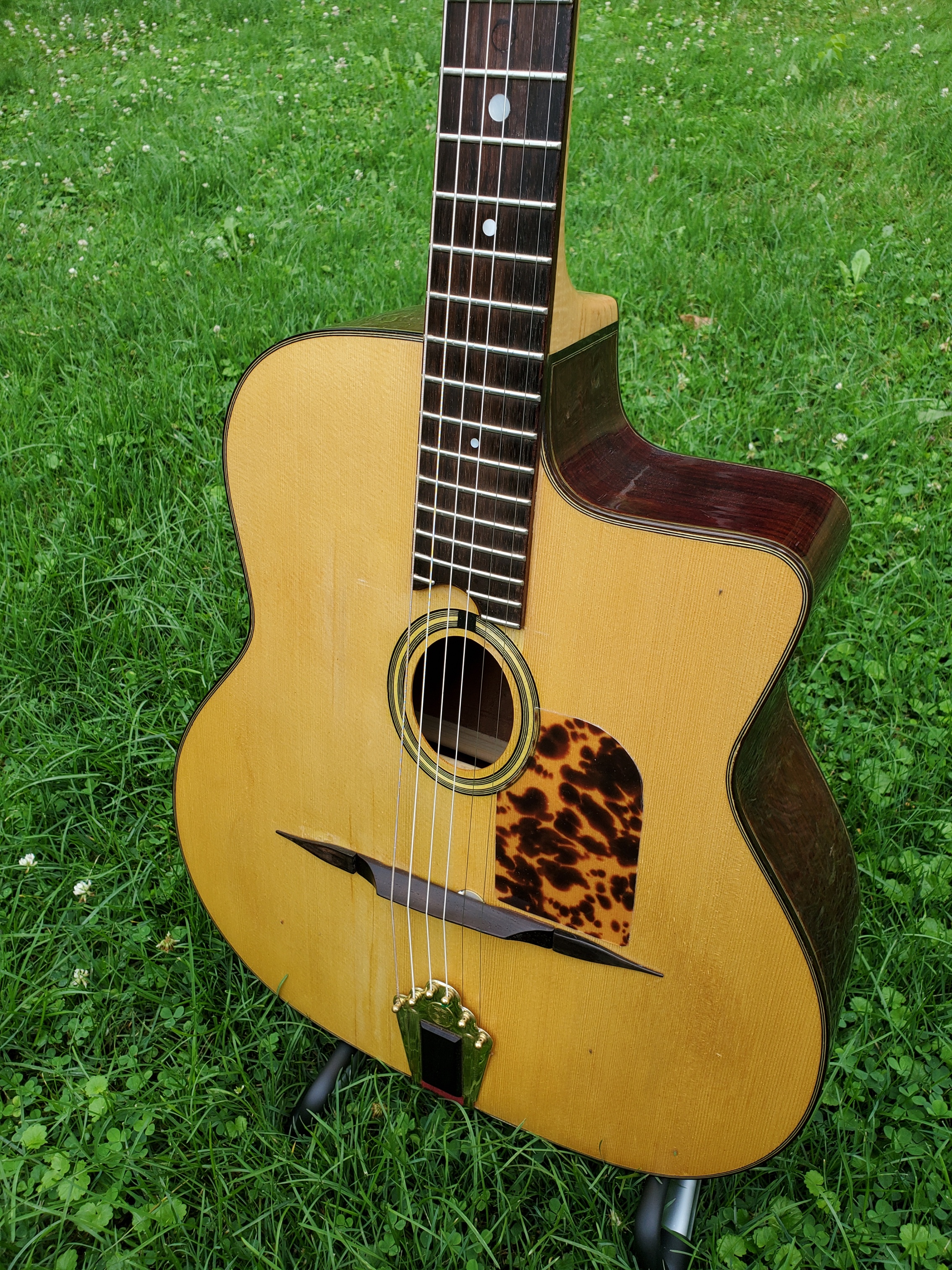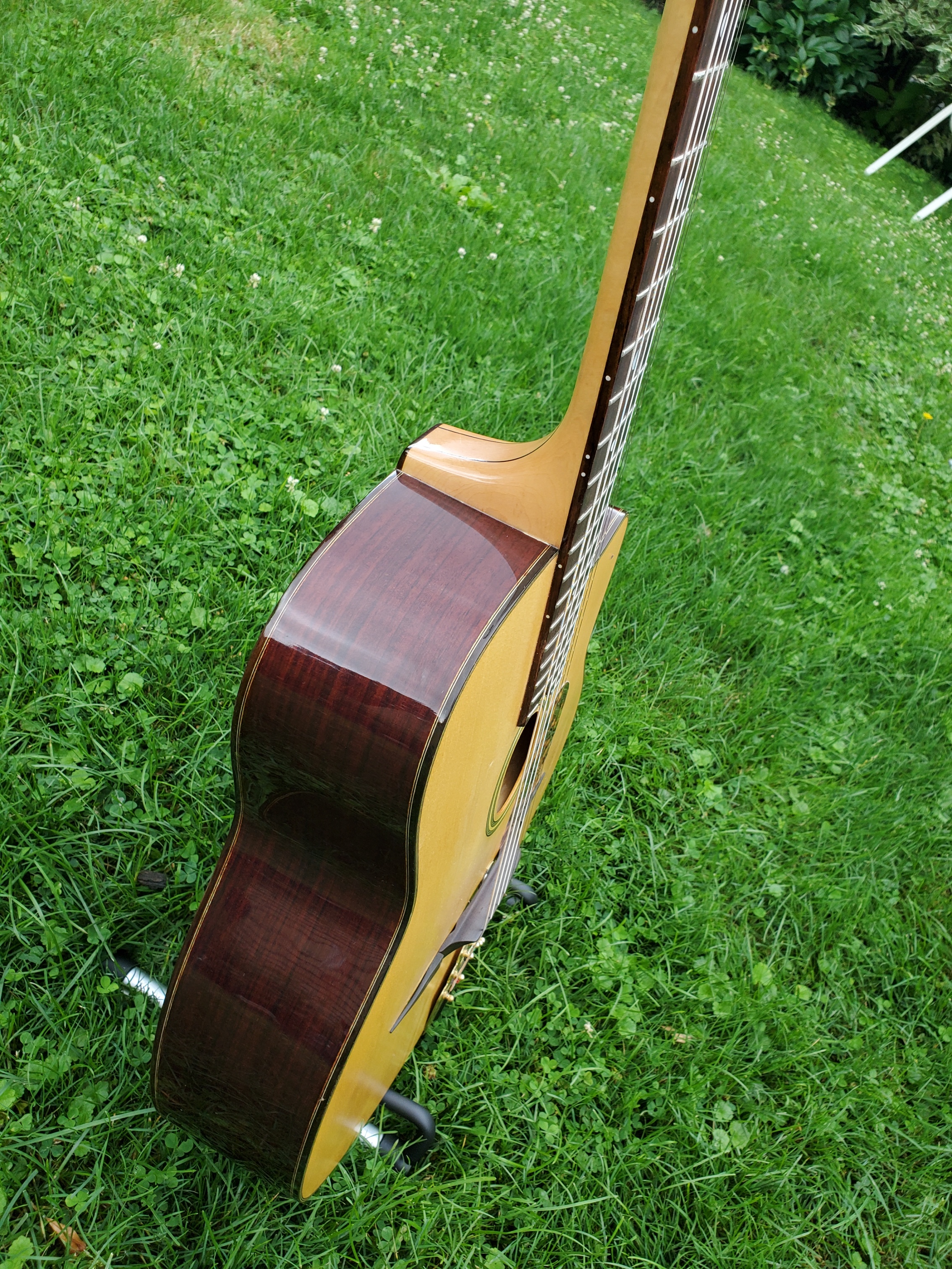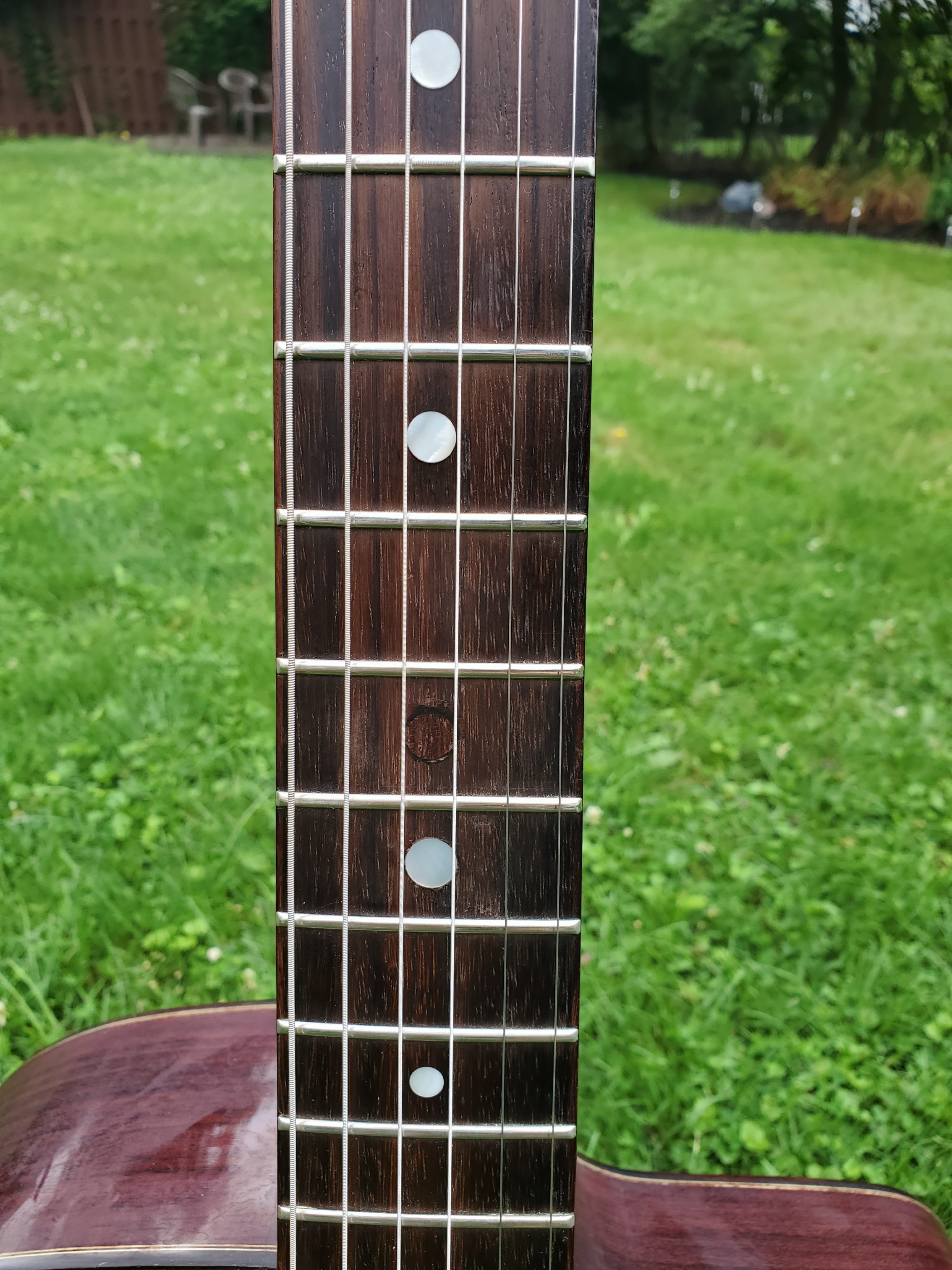 Superficial flaws (see photos) - thin top cracks that have been repaired and solid, a few frets missing from fingerboard extension, some finish touch up on side near tailpiece. If you look closely you can see evidence of the original 9th fret marker. Light nicks and scratches. The low E tailpiece post takes a loop end string because there is an old string stuck in the hole. (probably could be removed)