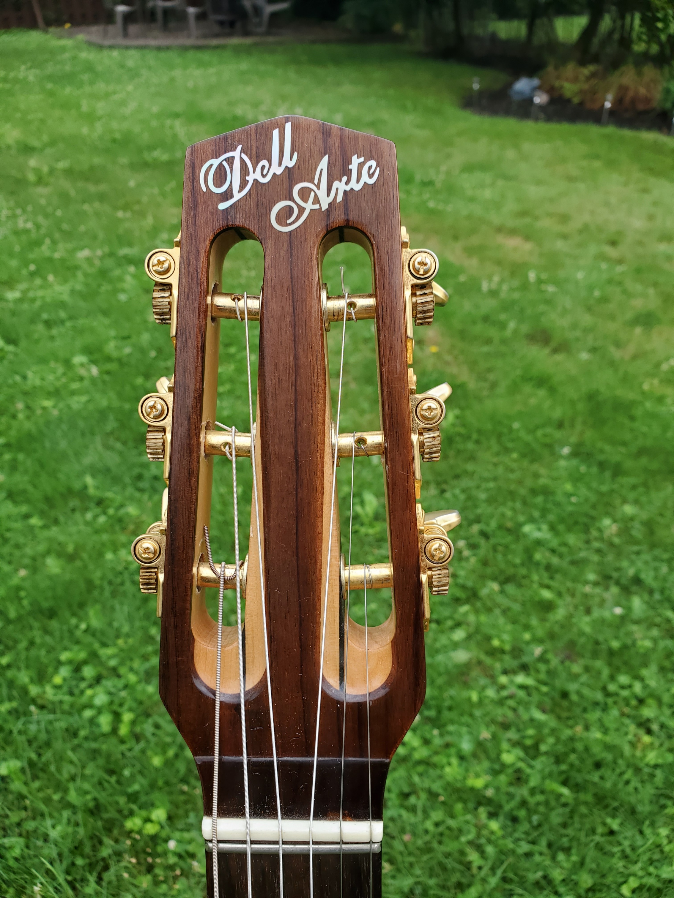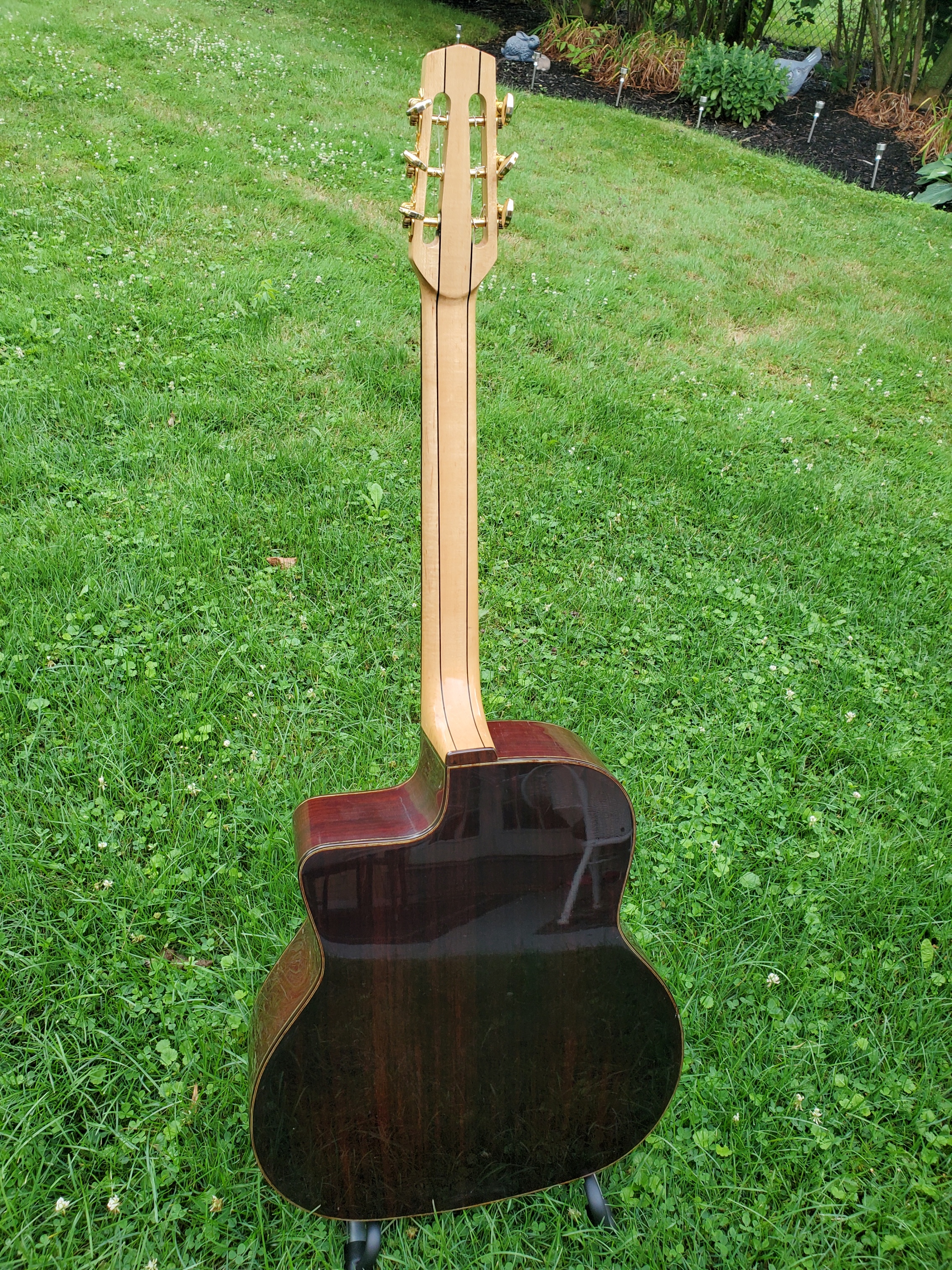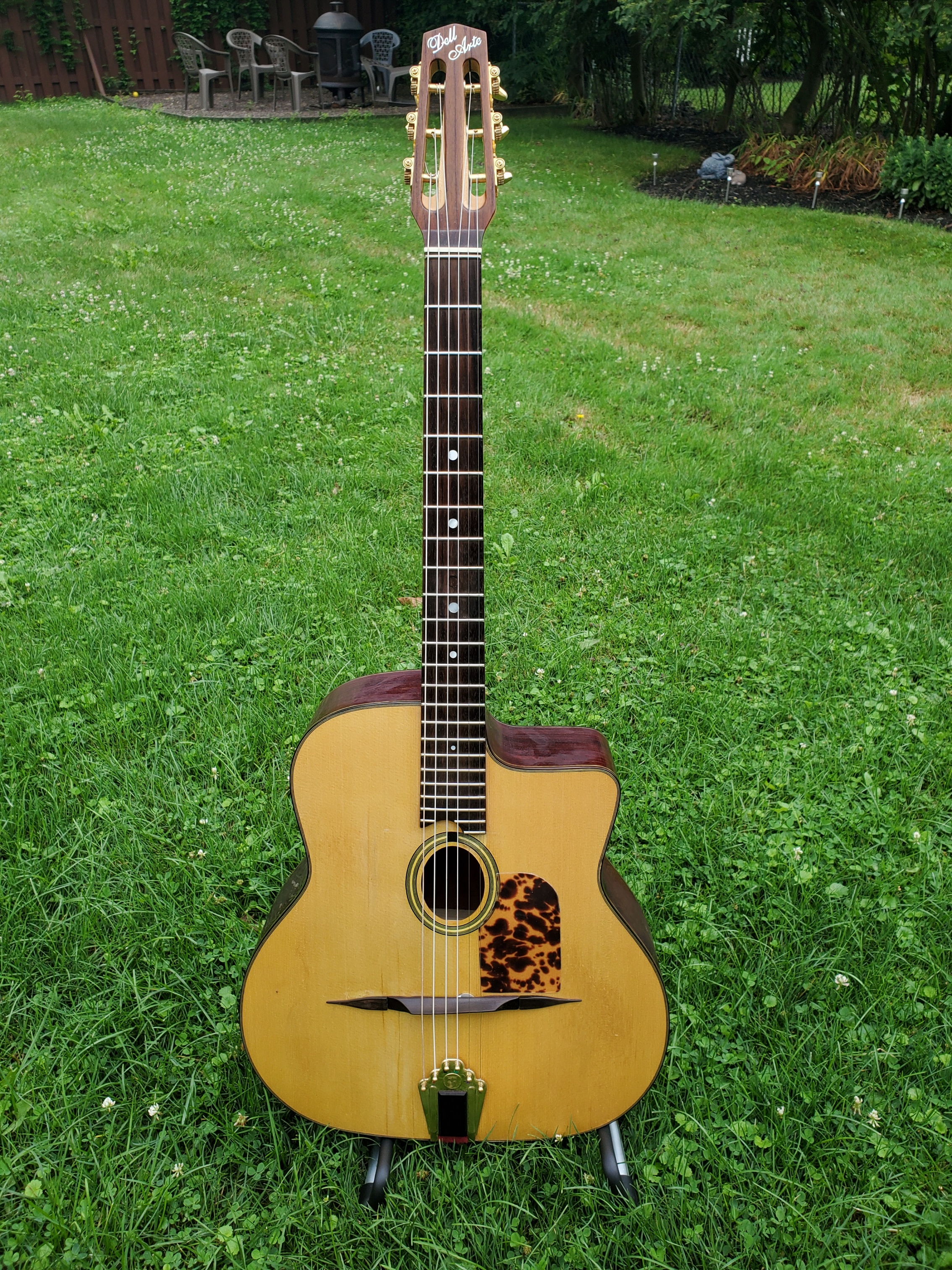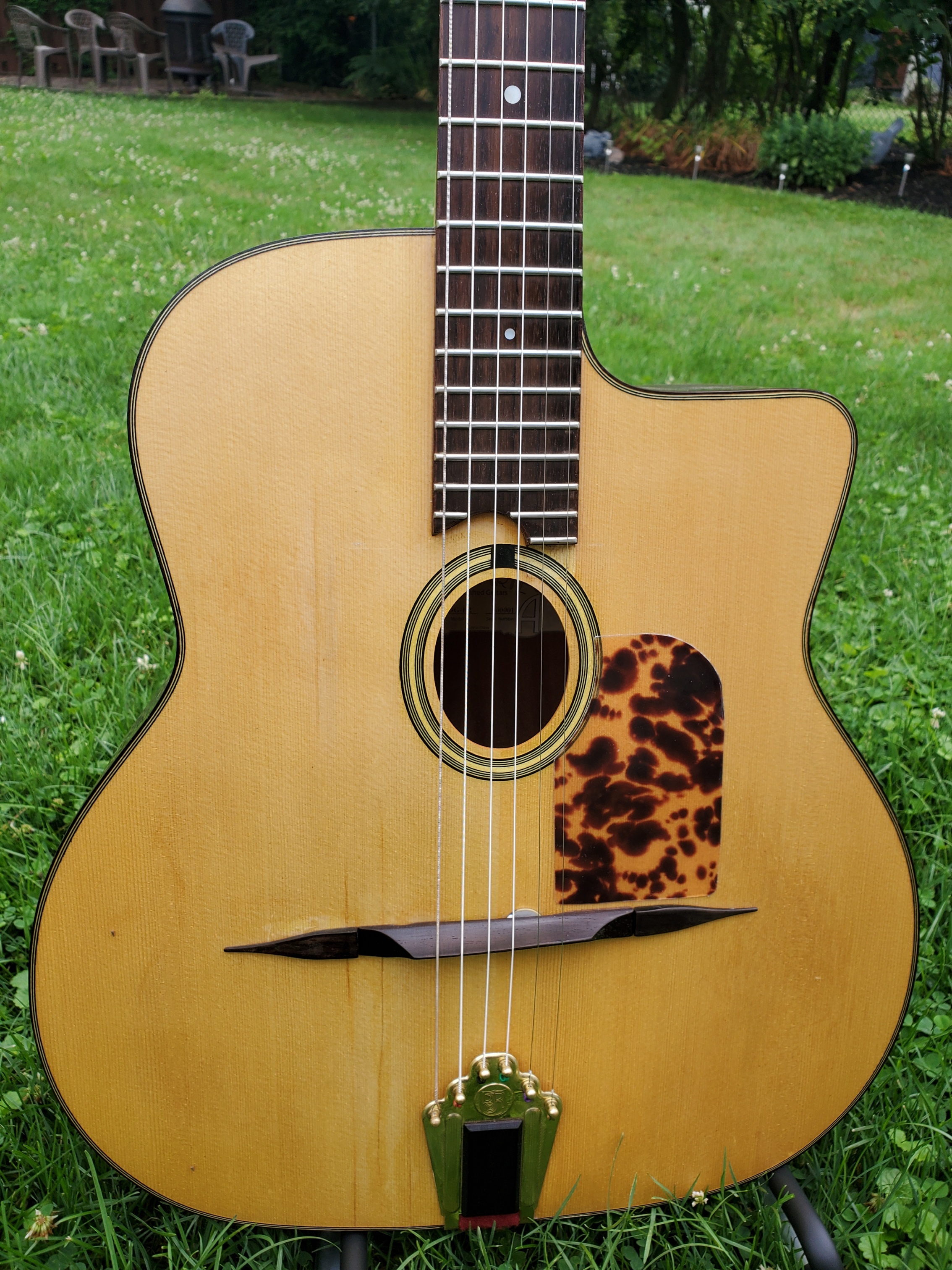 Superficial flaws (see photos) - thin top cracks that have been repaired and solid, a few frets missing from fingerboard extension, some finish touch up on side near tailpiece. If you look closely you can see evidence of the original 9th fret marker. Light nicks and scratches. The low E tailpiece post takes a loop end string because there is an old string stuck in the hole. (probably could be removed)