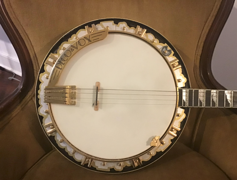However, over the past winter, I've been customizing my beautiful art deco plectrum banjo with a new flange (that's the "clouds" metal piece surrounding the drum)... I think it turned out nice...