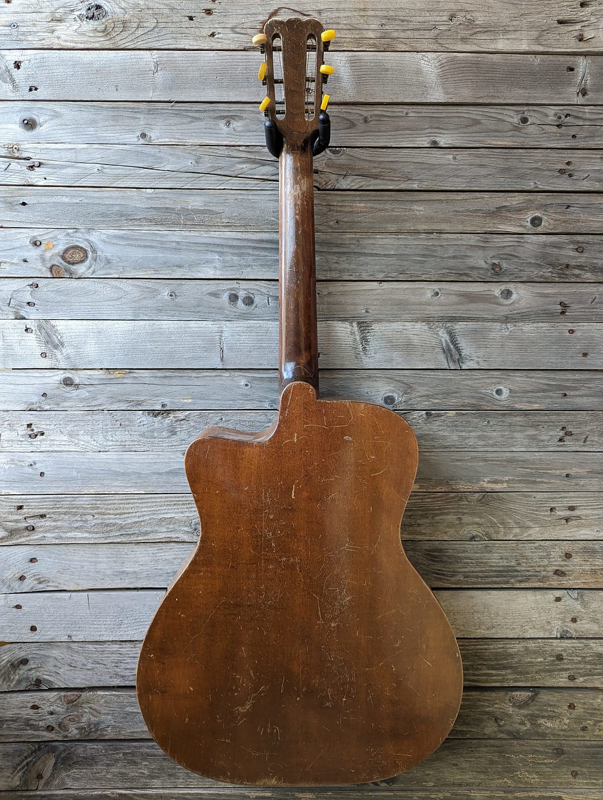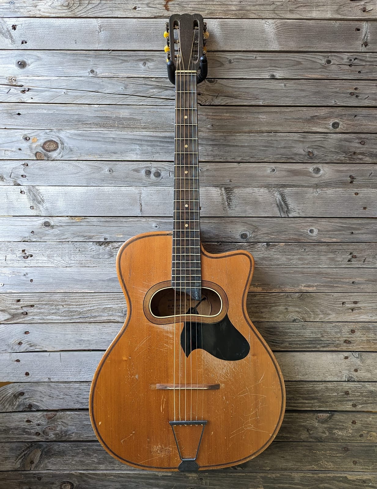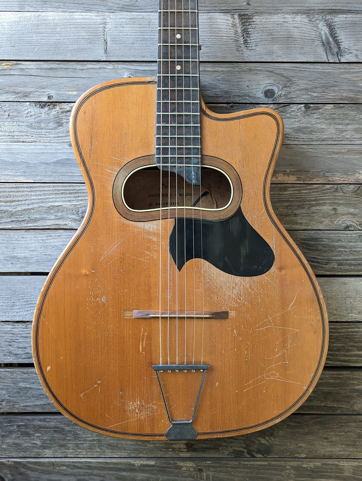Luthier Karsten Schnoor is restoring an old Patenotte. He is not sure but the guitar "feels like" 40ies more than 50ies.