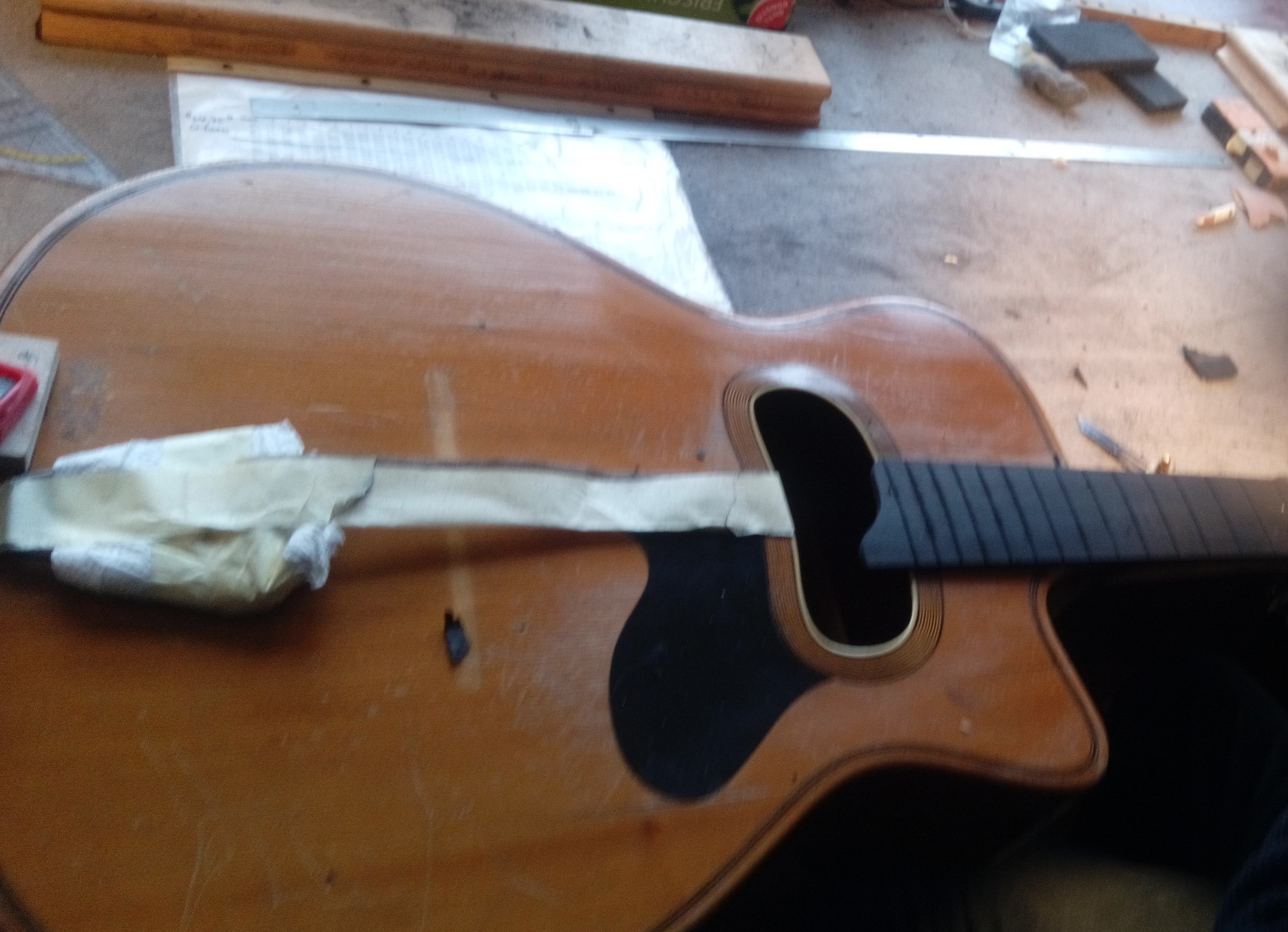 The neck was crooked, so Karsten inserted two carbon rods (no steel rod because the guitar is so wonderfully light).